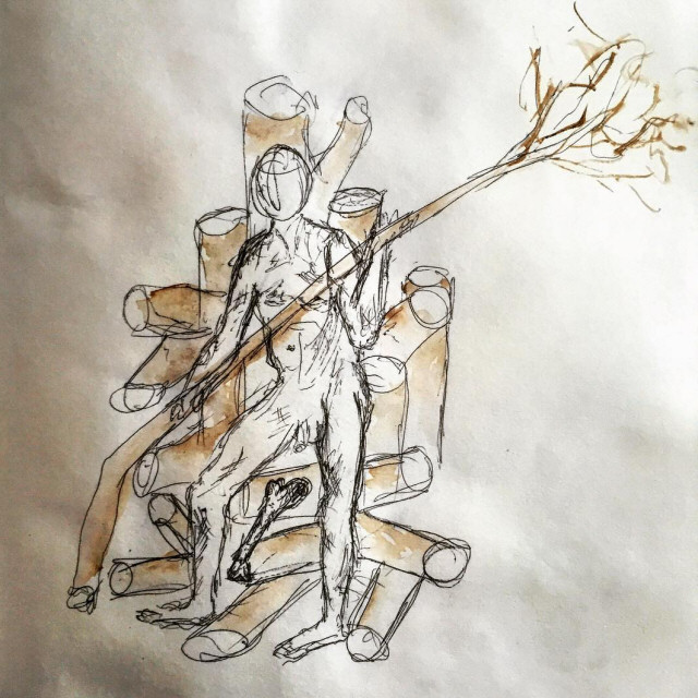 After this there was a brief interlude while the artists’ benches were shifted to face an interesting collection of sawn-off upright tree trunks. I kept a blanket wrapped snugly around me and privately hoped these manoeuvres would take a good long while. It was a false comfort, however, as for the next 10 minutes I would be posing solo without a stitch of clothing, and thus felt the cold more keenly than ever.