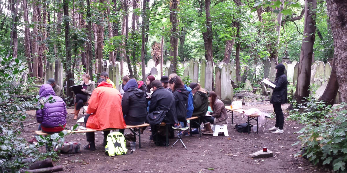 Barely a minute or two had passed when Alex and Ian arrived with 15-20 artists they’d collected from the main entrance. Three long wooden benches were arranged for them in an arc around the gravestones and woodpile that would be the backdrop to our first poses. When everyone was settled with drawing materials at the ready, Nikki began her introductions.