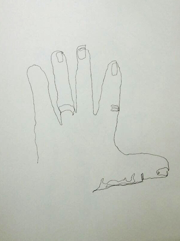 When at last the artists were assembled in one room, Nikki got them warmed up with a selection of exercises in unconscious drawing. These included inviting everybody to draw their passive hand: first blind line drawing with eyes closed, then continuous line drawing with eyes open and free association images superimposed afterwards.