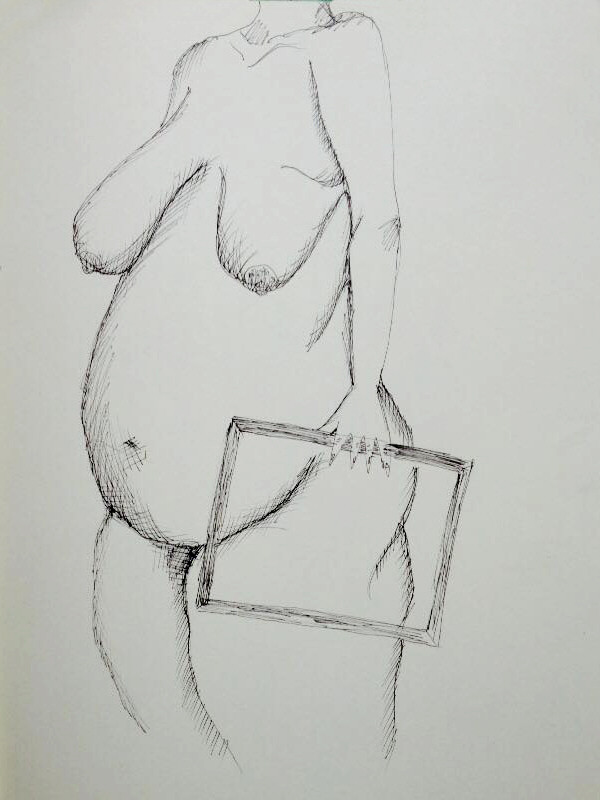 Artists were free to roam wherever they pleased, without time constraints. Through the doorway to my left they would find Gee posing with two empty picture frames that she positioned over various parts of her body. Freud’s theory of psychosexual development postulated that children focus on different parts of their bodies; now Gee’s artists were invited to do the same.