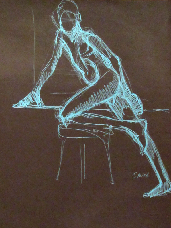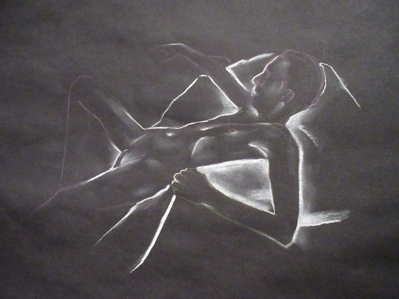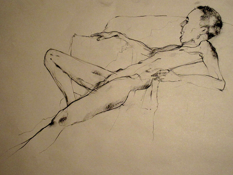 A single pose of 45 minutes occupied the second session. At my previous visit Lisa had been keen to put me in poses that would accentuate my long limbs. Despite her being – in her own words – “two foot shorter” than me, she demonstrated a sprawled, slouched, spread-eagled pose that she wanted me to try. I gave of my best.