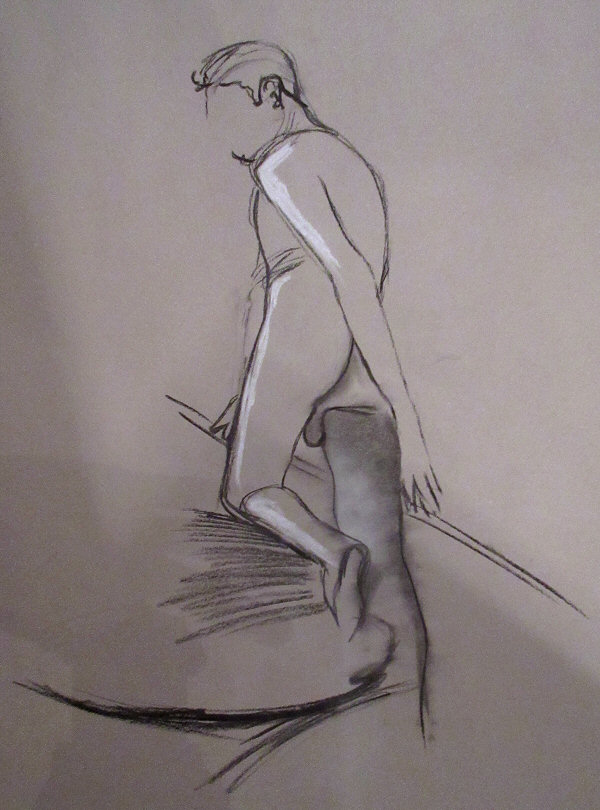 Loulou Reloulou was my co-model for the evening. She would be wearing strikingly flamboyant costumes in one room while I posed nude in another. We swapped rooms at half-time. In the first half I started off with a 15-minute pose that ran to 20; followed it with a 5-minute pose that ran to 10; and ended with a 25-minute pose bang on time.