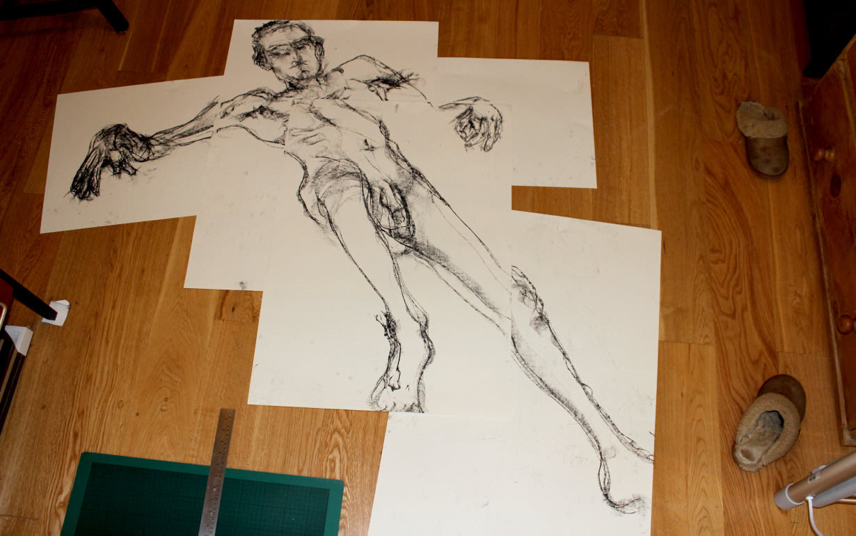 Excellent artworks were produced in both rooms. In the second half I was fascinated by artist Gemma Cook, who worked on four giant sheets of paper, laying each on the floor when she was satisfied with it. I couldn’t see exactly what was going on whilst in pose but, when finally free to look, I was astounded by her superb work.
