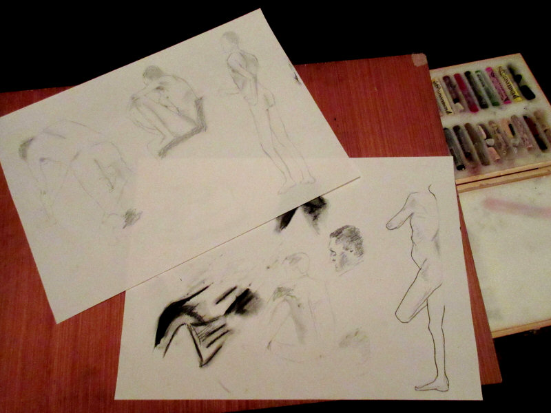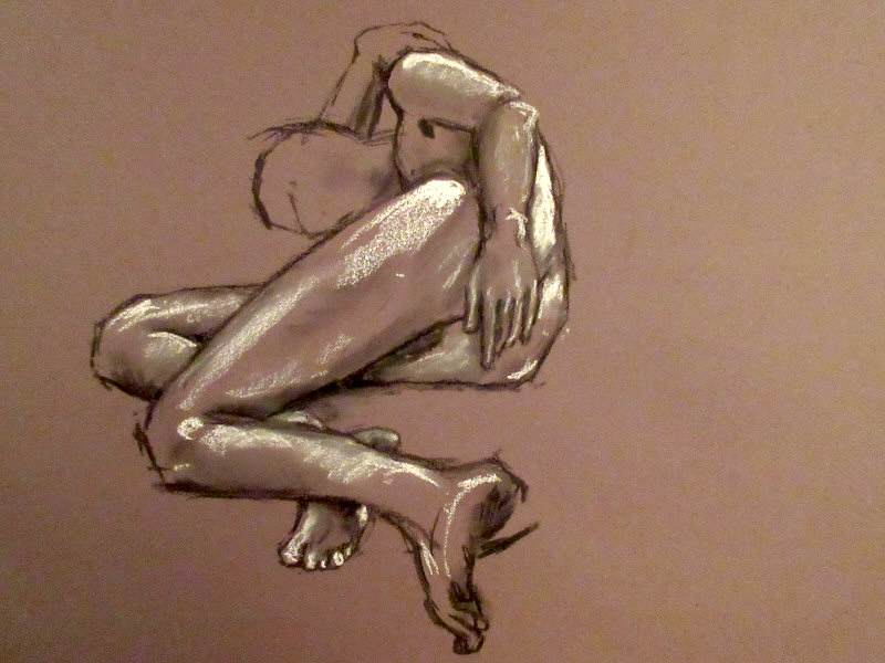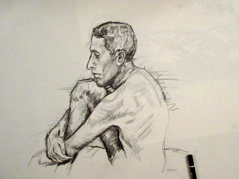 Nonetheless, aside from the one possible drowsy aberration, this was a good focused session for fourteen artists. We began with three dynamic 1-minute poses followed by 2-minute, 5, 10 and 15-minute poses. The last pose before a break was the 25-minute recliner. In the final session, I passed 10-minutes standing on one leg, and 30-minutes seated upon the floor.