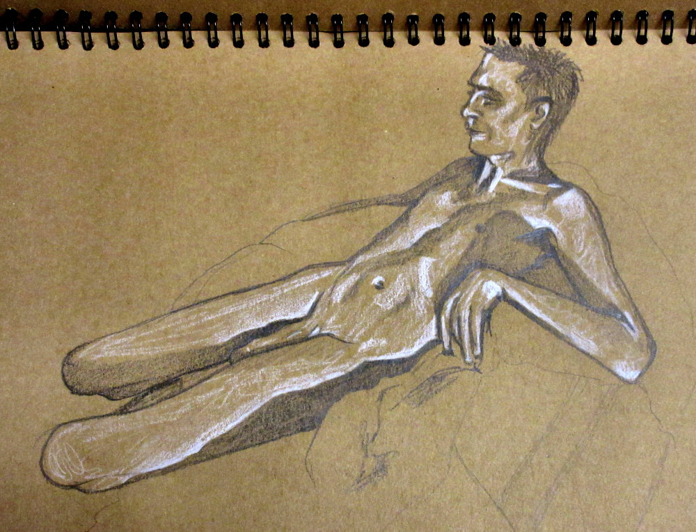 Afterwards I settled down on beanbags for a 45-minute side-lit pose, taking us to the end. I was very comfortable, drifting without danger of snoozing, until the last quarter of an hour when a dull pain made itself severely known in my right thigh. As always, one perseveres. The posture was well received, and well captured by the artists.