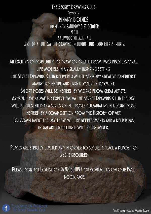 We were there to present ‘Binary Bodies‘, the first ever all-day event staged by The Secret Drawing Club. Louise and Nick had founded this life drawing group earlier in the year, sharing in its organisation; Louise is its model in residence, whilst husband Nick adds his artist’s perception to their detailed research and the creation of themes inspired by classical art.