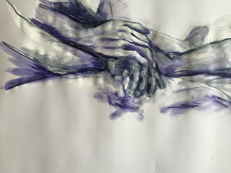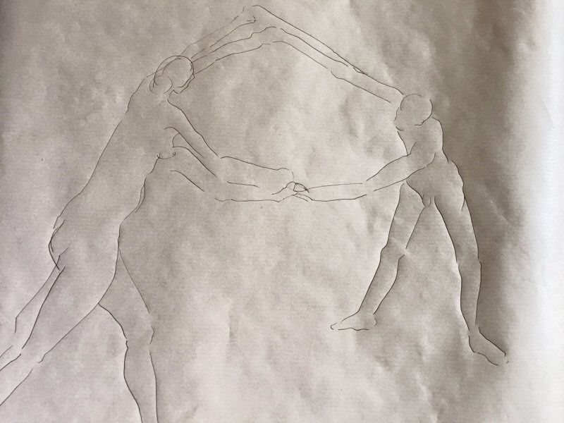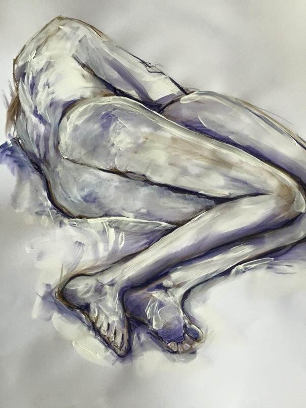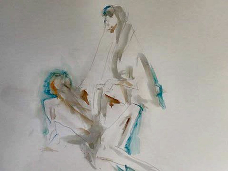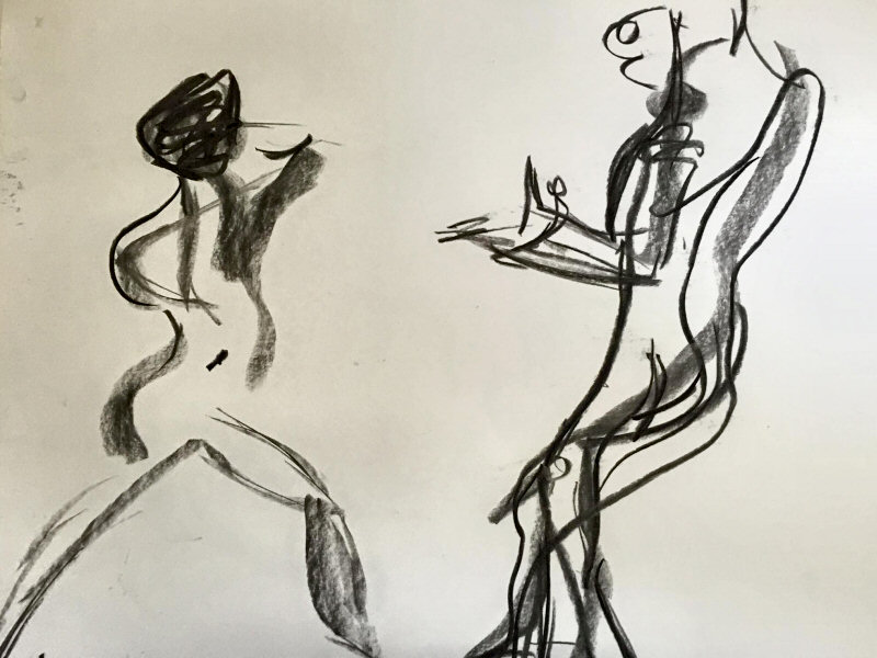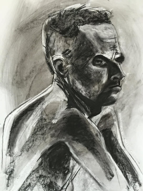 Staying bright-eyed and alert would be the challenge. We were to model for 14 artists between 10am and 4pm, with two 15-minute breaks plus a full hour for lunch. The first hour was devoted to short dynamic poses, none longer than 10 minutes, all featuring some manner of interaction. We were nude, or wrapped in a sheet, or holding wooden tribal masks. In several tableaux we interpreted classical sculpture or painting.