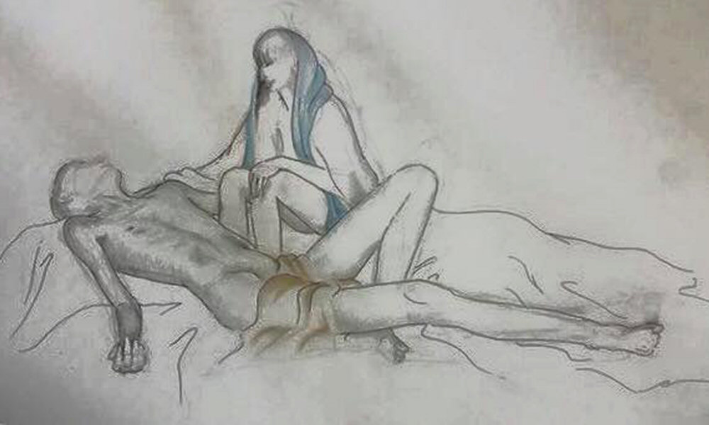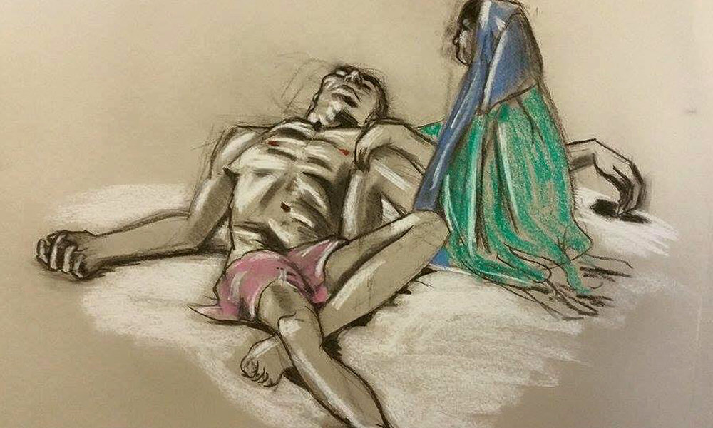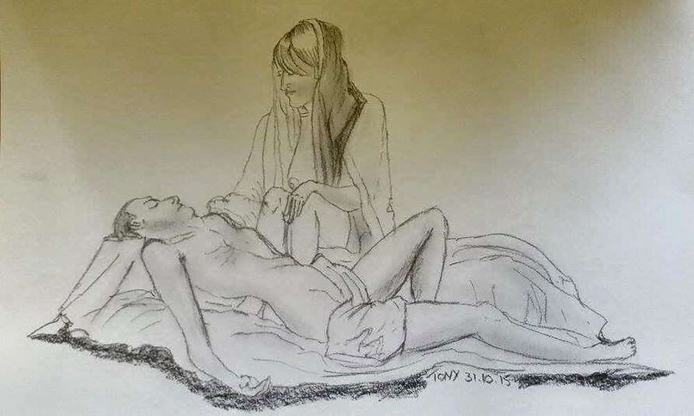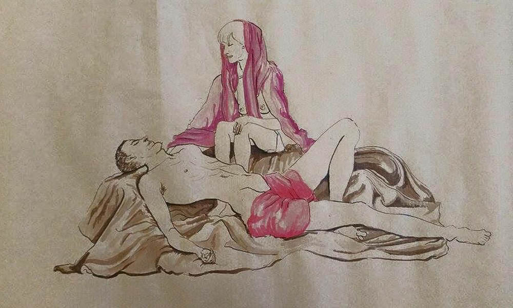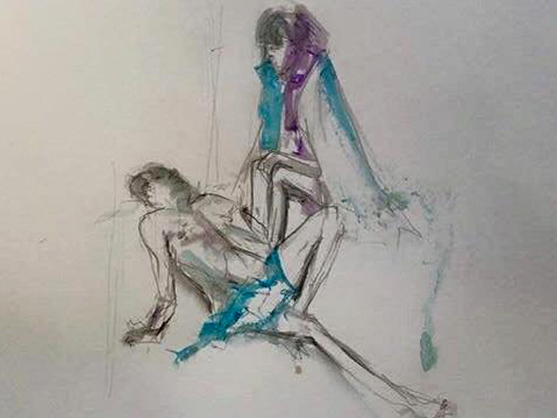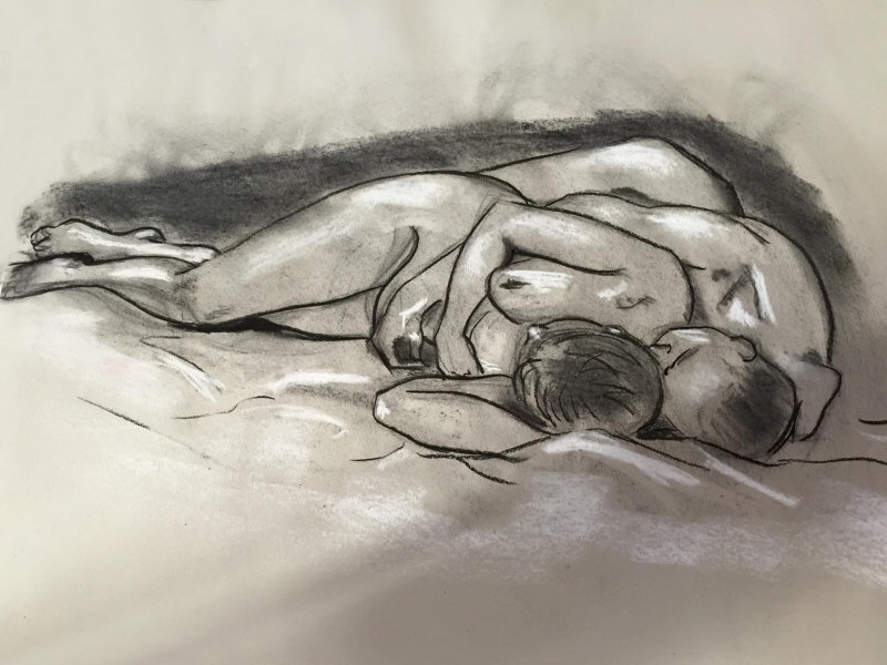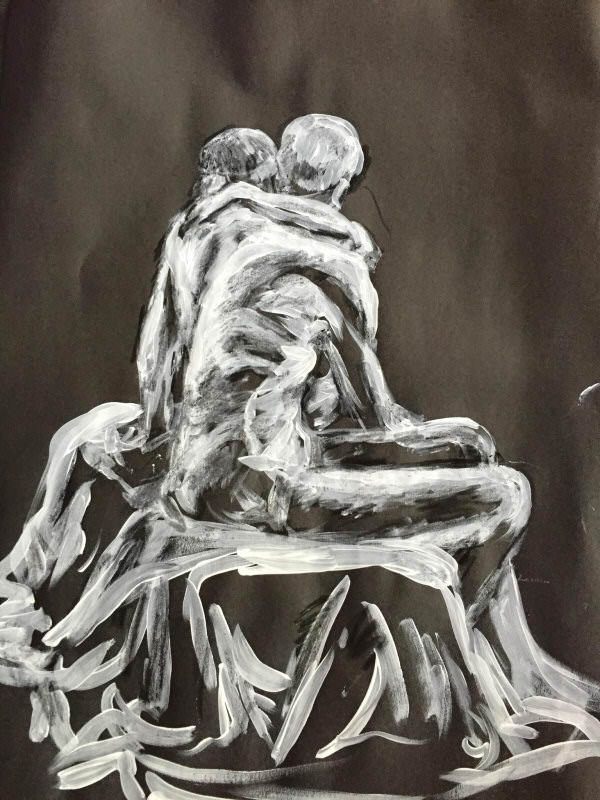 Our final 75-minute pose was inspired by ‘Pietà‘ – Michelangelo’s stunningly beautiful sculpture in St. Peter’s Basilica, Vatican City. Given our respective physiques and the potential discomfort that could be inflicted over such a long time, we didn’t attempt an exact reproduction. Even so, I think we managed to look pretty elegant. The artists’ drawings reflected this superbly, as we admired when finished.