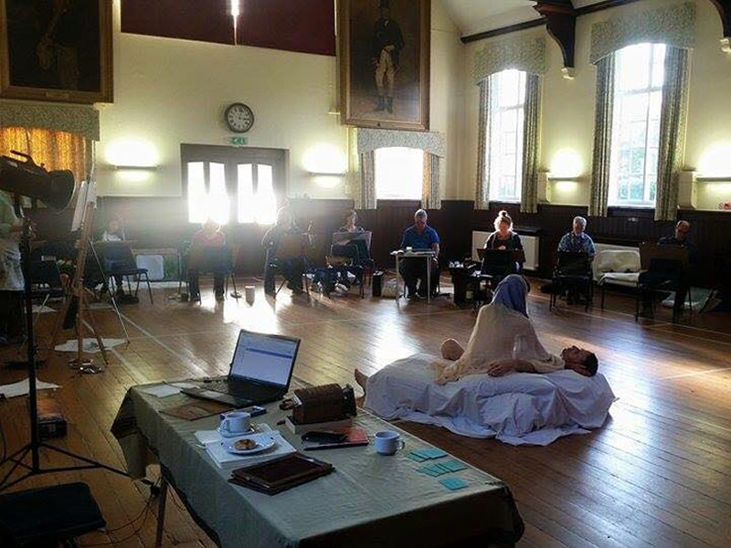 After lunch we returned to the centre of the hall for two half-hour seated poses. In the first of these we created a simple connection, like an embrace but both facing in the same direction. For the second we sat close to each other at right-angles – not with physical contact, but both ‘reading’ books. Without wearing my glasses, of course, I could hardly see the text, let alone read it.