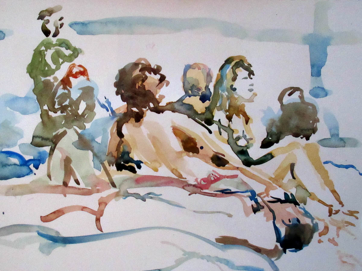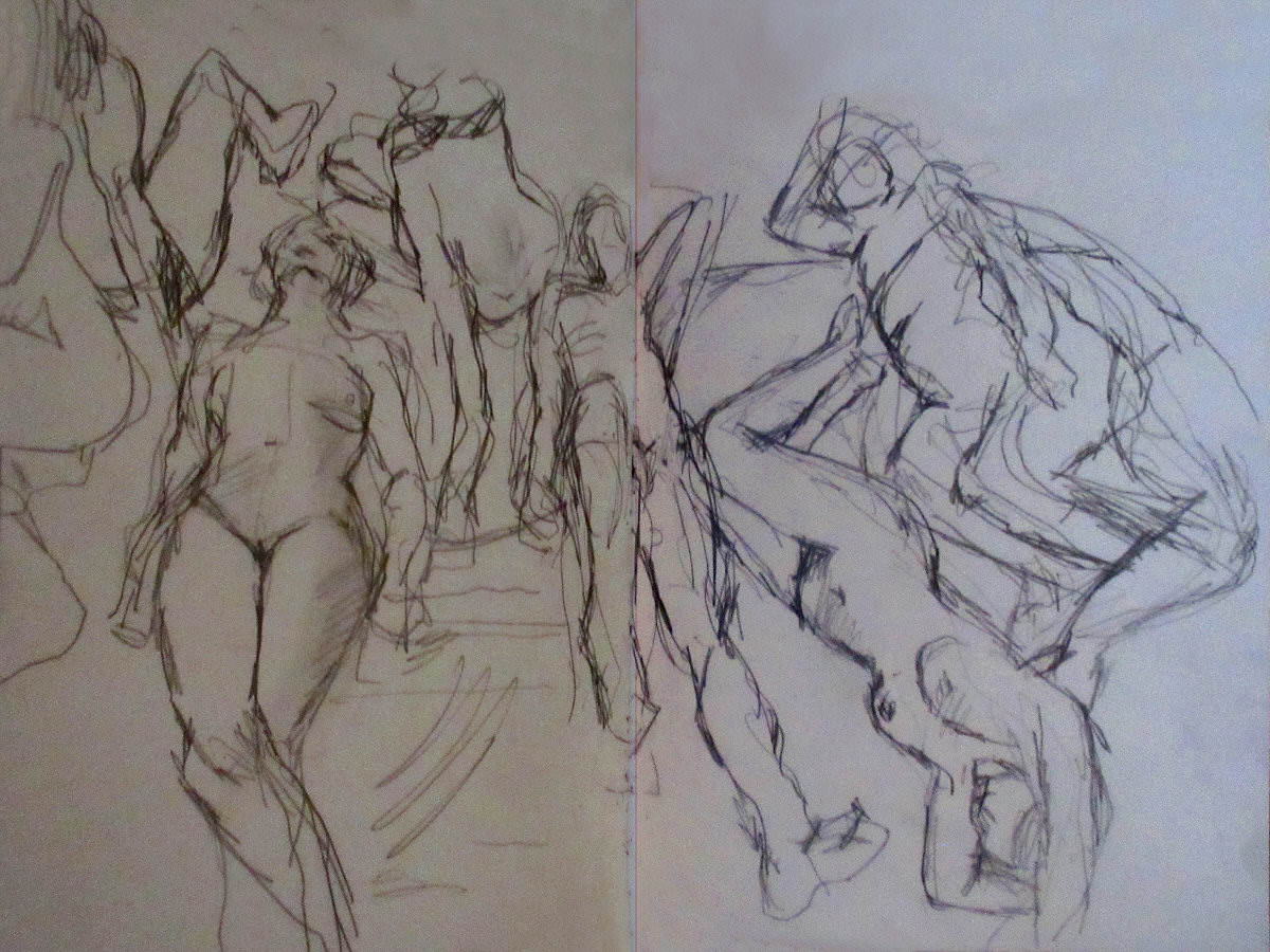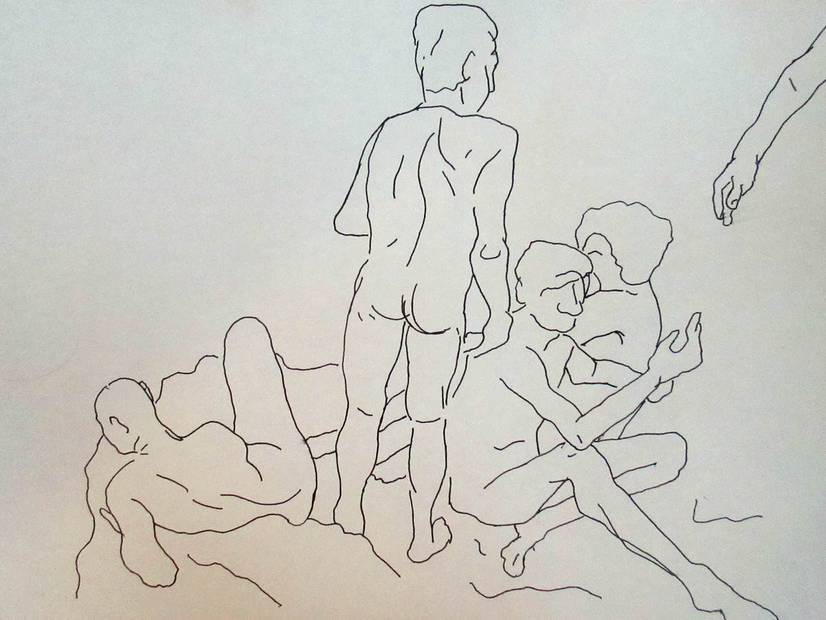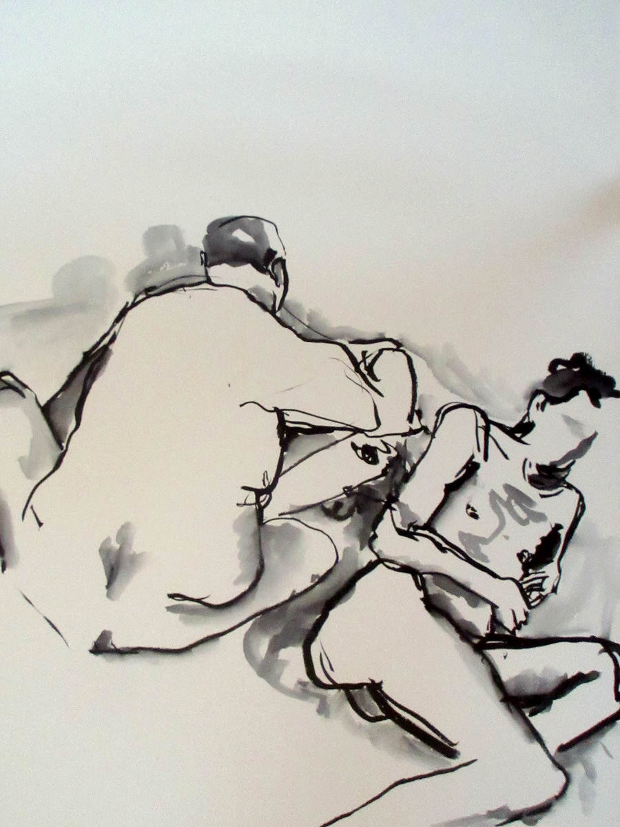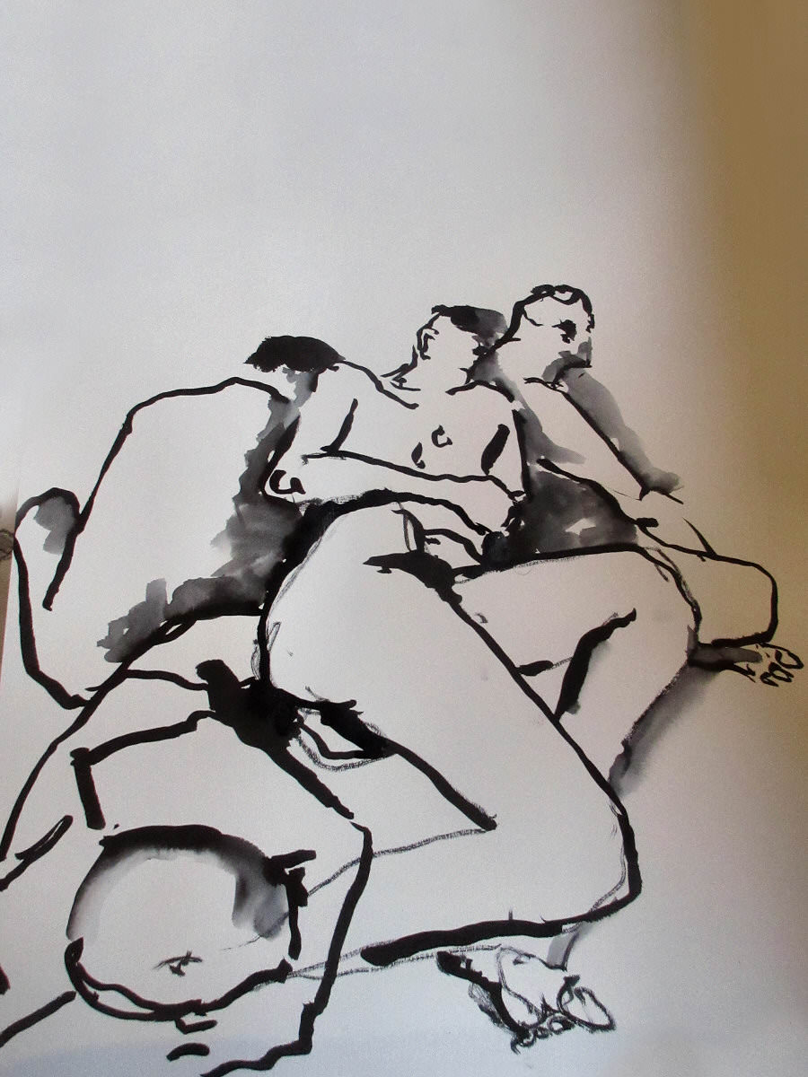 I manoeuvred myself to one end of our river and lay down with open arms. After about a minute, Esther undressed and eased herself down gently into the curve of my body to complete a spooning embrace. It was a tender moment and seemed like a suitably subtle way to show the observant among our friends that there might be more to us. Afterwards, Esther, Frances and Judit stepped from the pose space and left the rest of us to be grounded as earth, closing what had been a wonderful session.