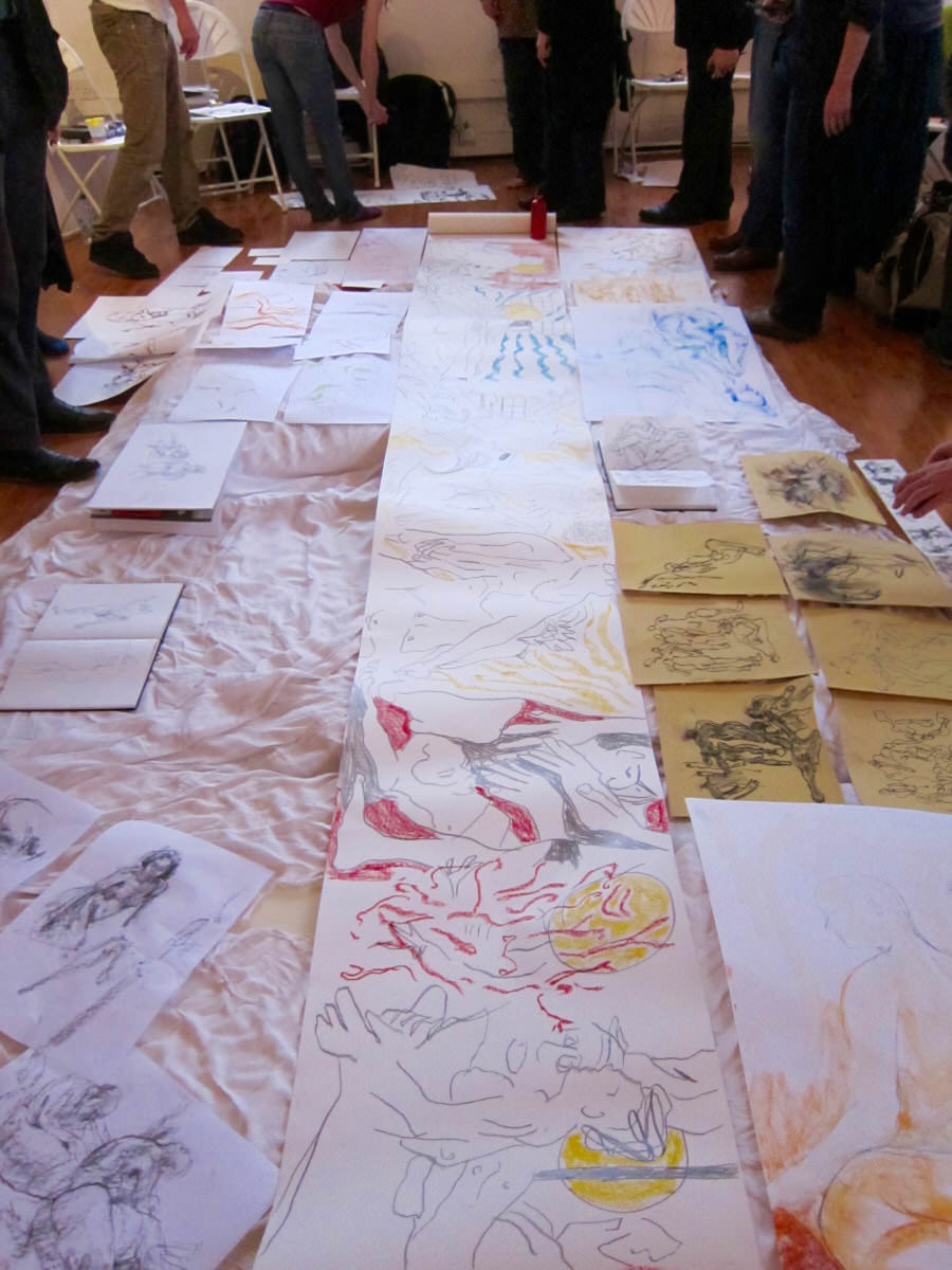 Artists spread their artworks on the floor for us all to appreciate. Many had used their imaginations to great effect in capturing the energy of our spirited bodies in tune with spirited sound. By general consensus, this had been an excellent afternoon all round. After the earlier stresses of the weekend I was especially happy for Esther, and for Sarah too. Not everyone is privileged to see the numerous difficulties that must be overcome when staging events like this. Their success was richly deserved.