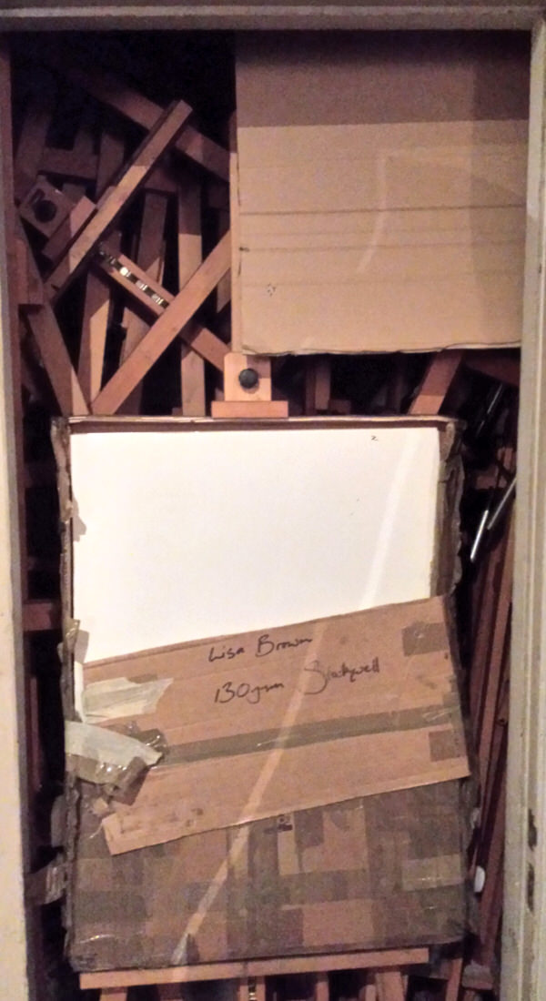 Come the evening, upstairs at The Prince Regent pub we opened the door of Lisa’s storage cupboard and stood briefly in amazement. She’d warned us it was crammed tightly with art equipment, and sure enough we found an astonishing tangle of easels, lamps, boards, papers, boxes and bags that even a ferret might have struggled to get amongst. Nonetheless we’d been provided with a clear list of instructions so together we began the delicate procedure of unpacking.