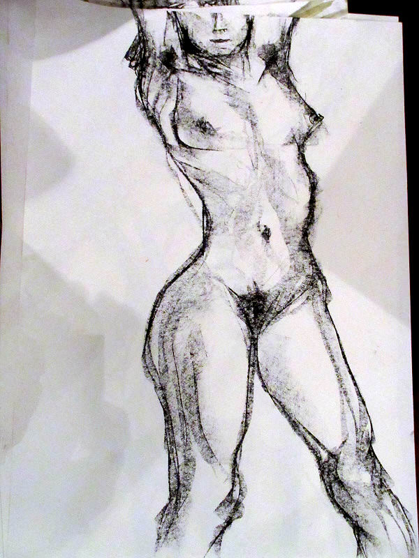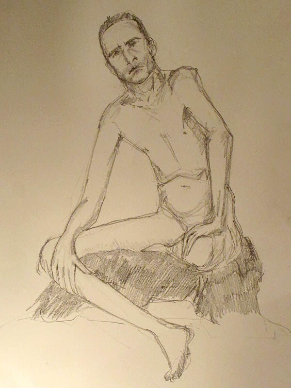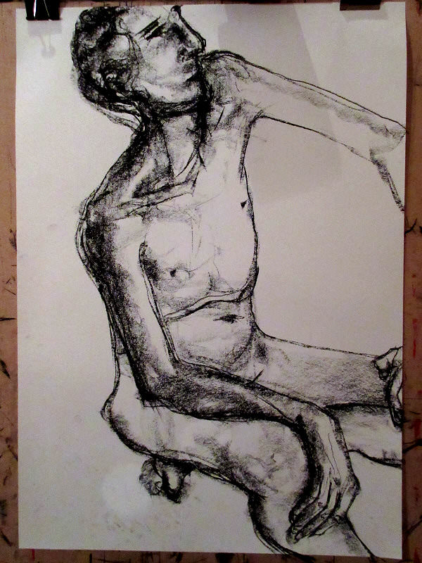 With heavy hearts, Esther and I commenced our posing, out of sight from each other in separate rooms. Esther set the timer on her phone and called to me whenever its alarm sounded our signal to change pose. Regular artists had given us a steer as to the pose lengths they would prefer. We began with four 5-minute poses; then moved to two of 10-minutes; and followed with one of 20-minutes, taking us to the end of the first half.
