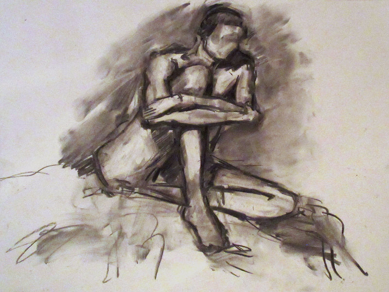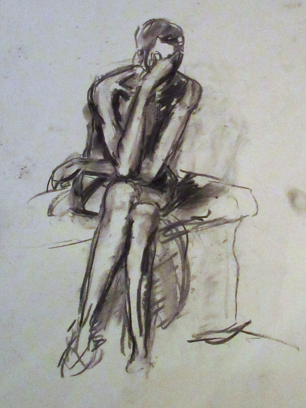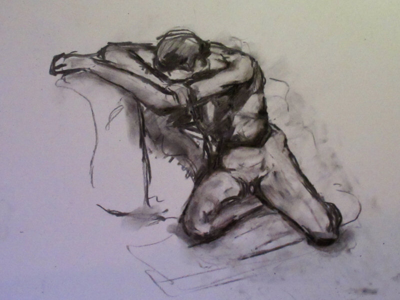 For the two longest poses of the evening I unintentionally put myself through a certain amount of pain. For 20 minutes I sat upon the platform with legs bent underneath me and body twisted backwards across the bench, straining my sides. After the break, I went 30-minutes seated on the bench with one knee raised – easy on the floor, but a back-aching balance on a narrow shelf of wood.