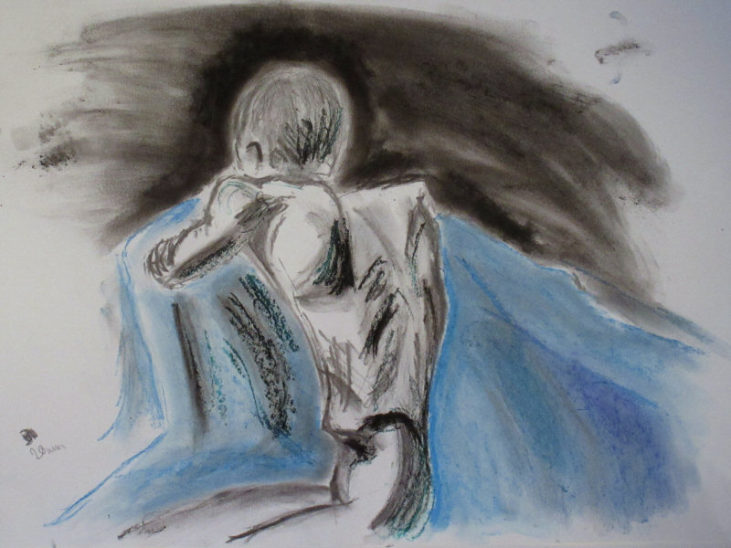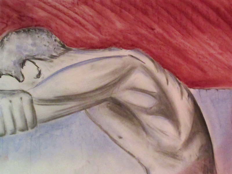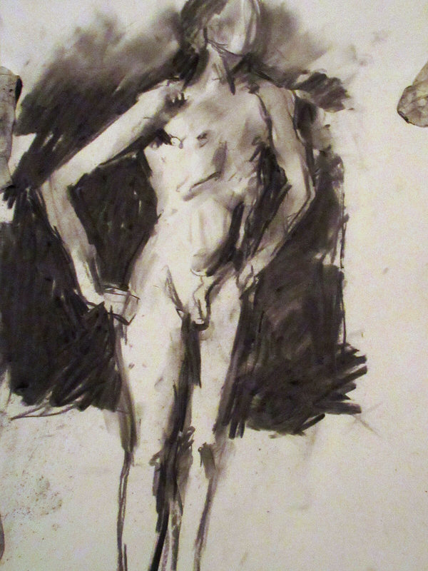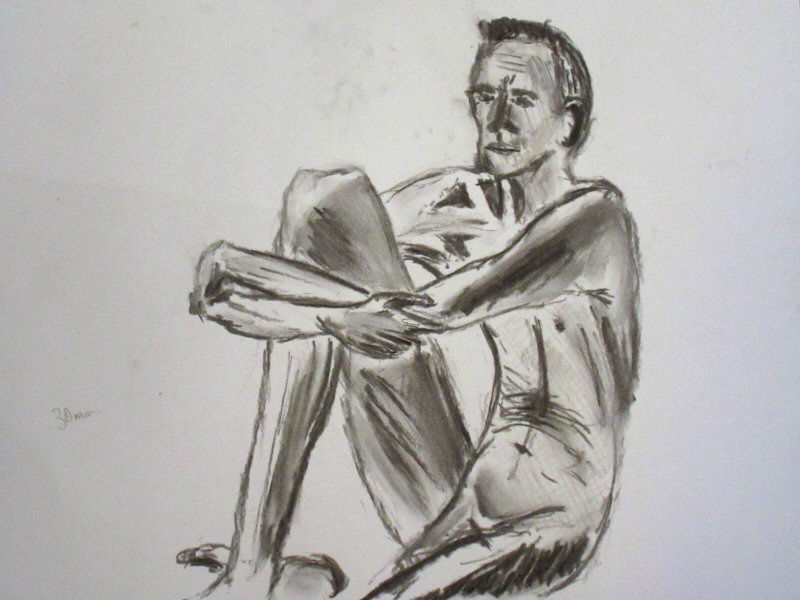We started 5, 3, 1, 5 – dynamic poses, twisted with limbs accentuated. I was naked on a raised spotlit platform equipped with a backless bench covered by pillows and a sheet. Scattered between tables around the Cellar, thirteen artists observed me from behind their drawing pads. I stood with arms raised for 10-minutes then took it easy, sitting cross-legged on the bench for quarter of an hour.