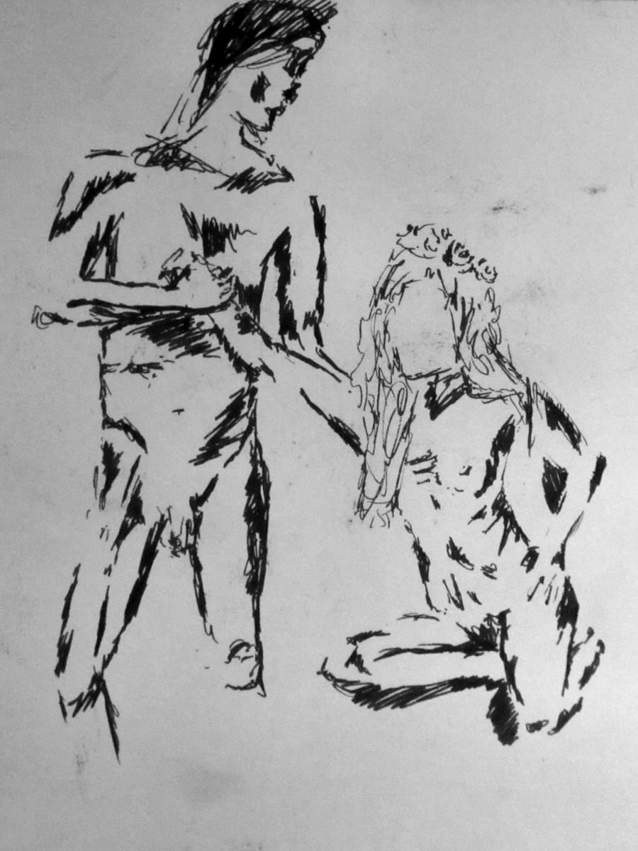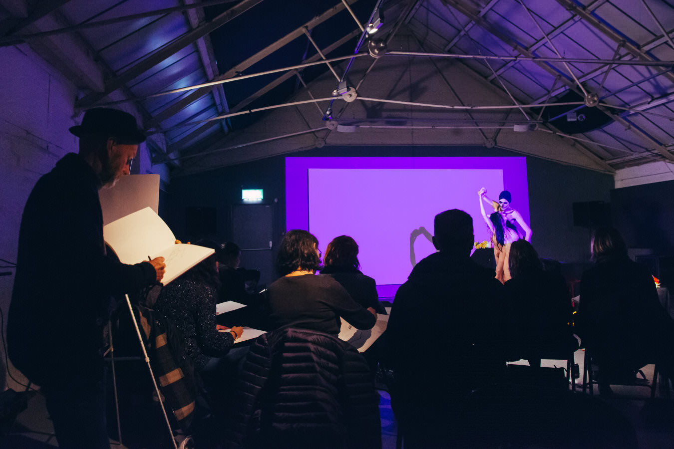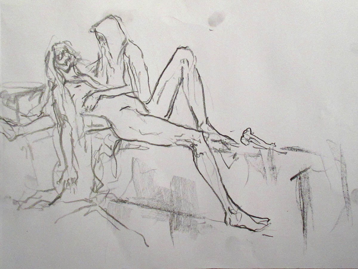 As we neared 6:30pm, the warehouse began filling with patrons. Nikki emerged at the appointed time to set the scene for our evening’s entertainments and to get the artists warmed up by asking them to draw visions of death from their own imaginations. After this, Esther and I stepped forward in our robes for the first sequence of poses. It would be a reprise of the Death and the Maiden poses we’d presented in Oxford.