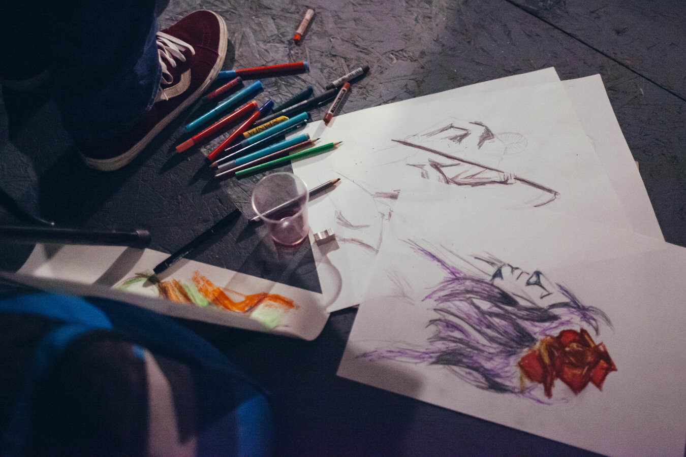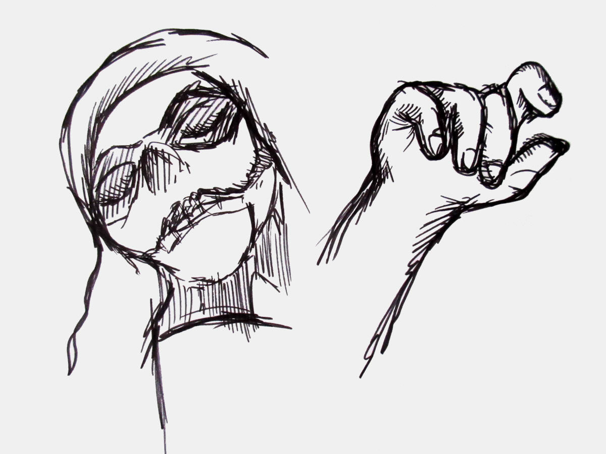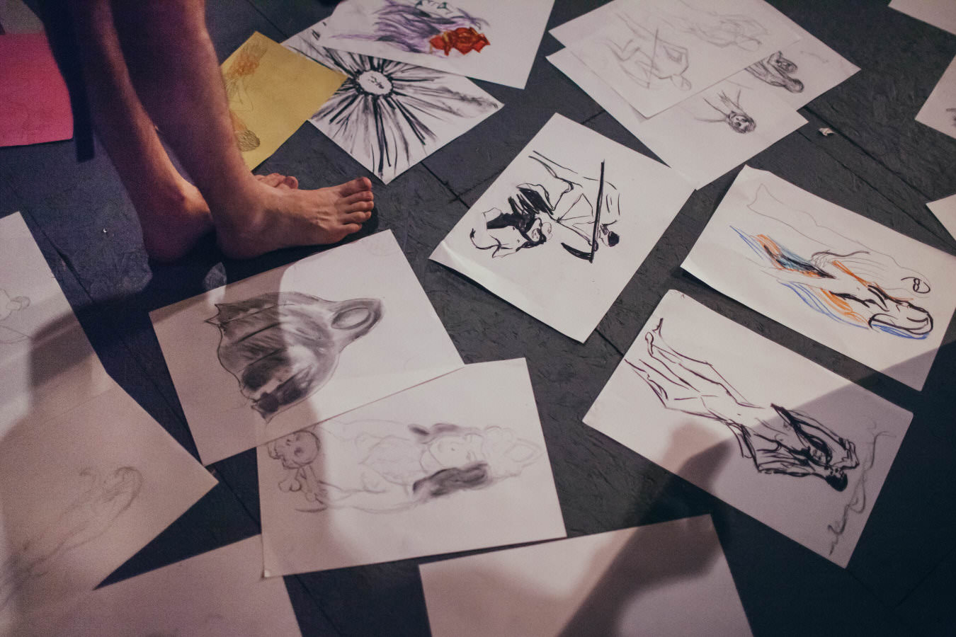 As we neared 6:30pm, the warehouse began filling with patrons. Nikki emerged at the appointed time to set the scene for our evening’s entertainments and to get the artists warmed up by asking them to draw visions of death from their own imaginations. After this, Esther and I stepped forward in our robes for the first sequence of poses. It would be a reprise of the Death and the Maiden poses we’d presented in Oxford.