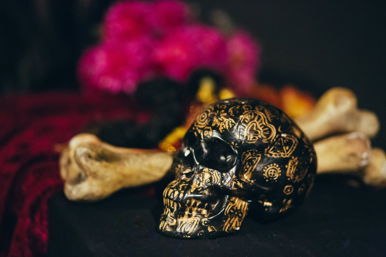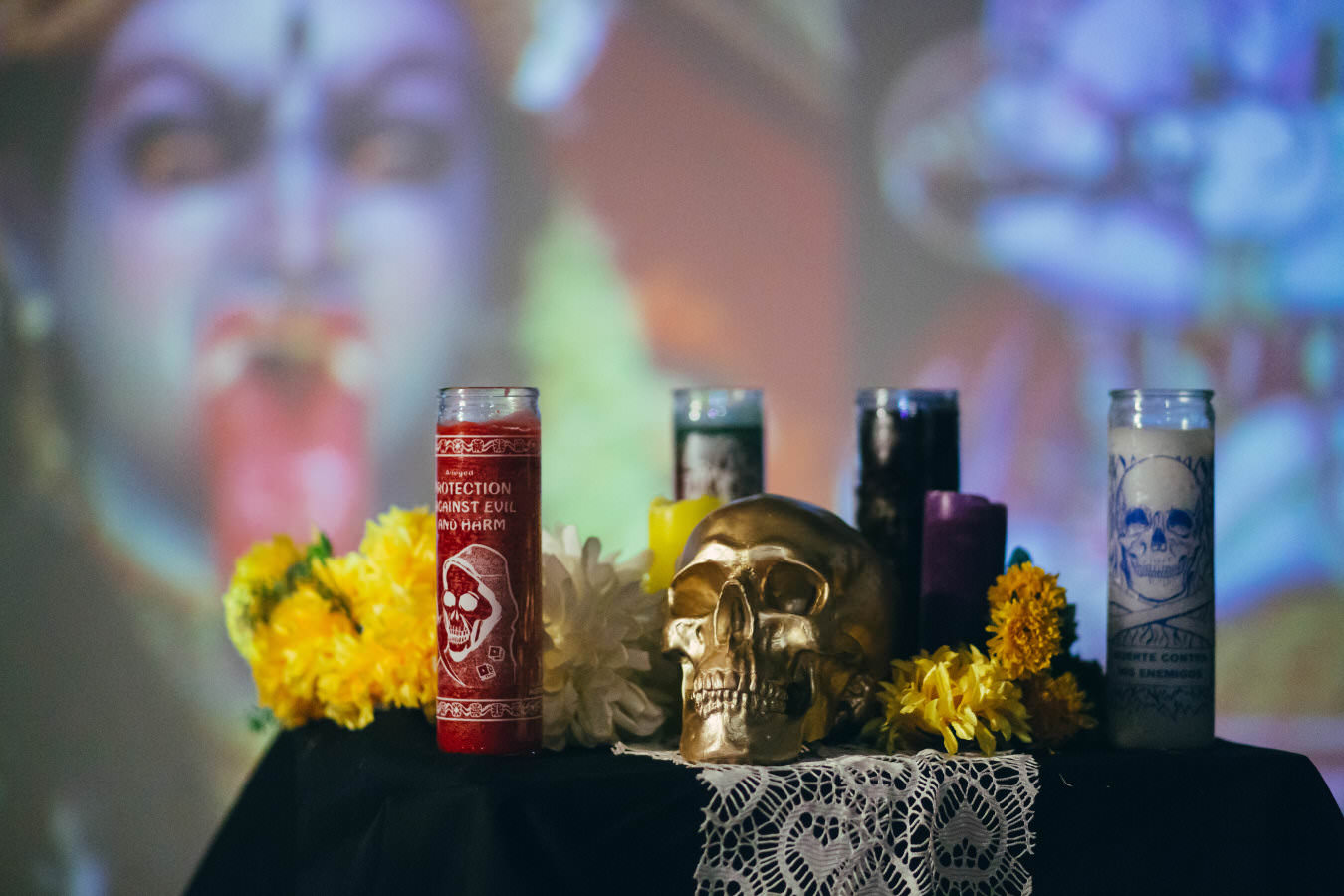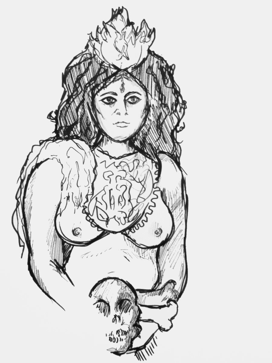 As all this unfolded, Nikki was painting Geeta’s face blue in readiness for the following poses. Geeta would be Kali – the Hindu goddess associated with empowerment. She began with a 5-minute standing pose in which one arm was crooked upwards and the other downwards. After this, she posed for 10-minutes seated upright with both hands holding an Art Macabre finely-painted black clay skull on her lap.