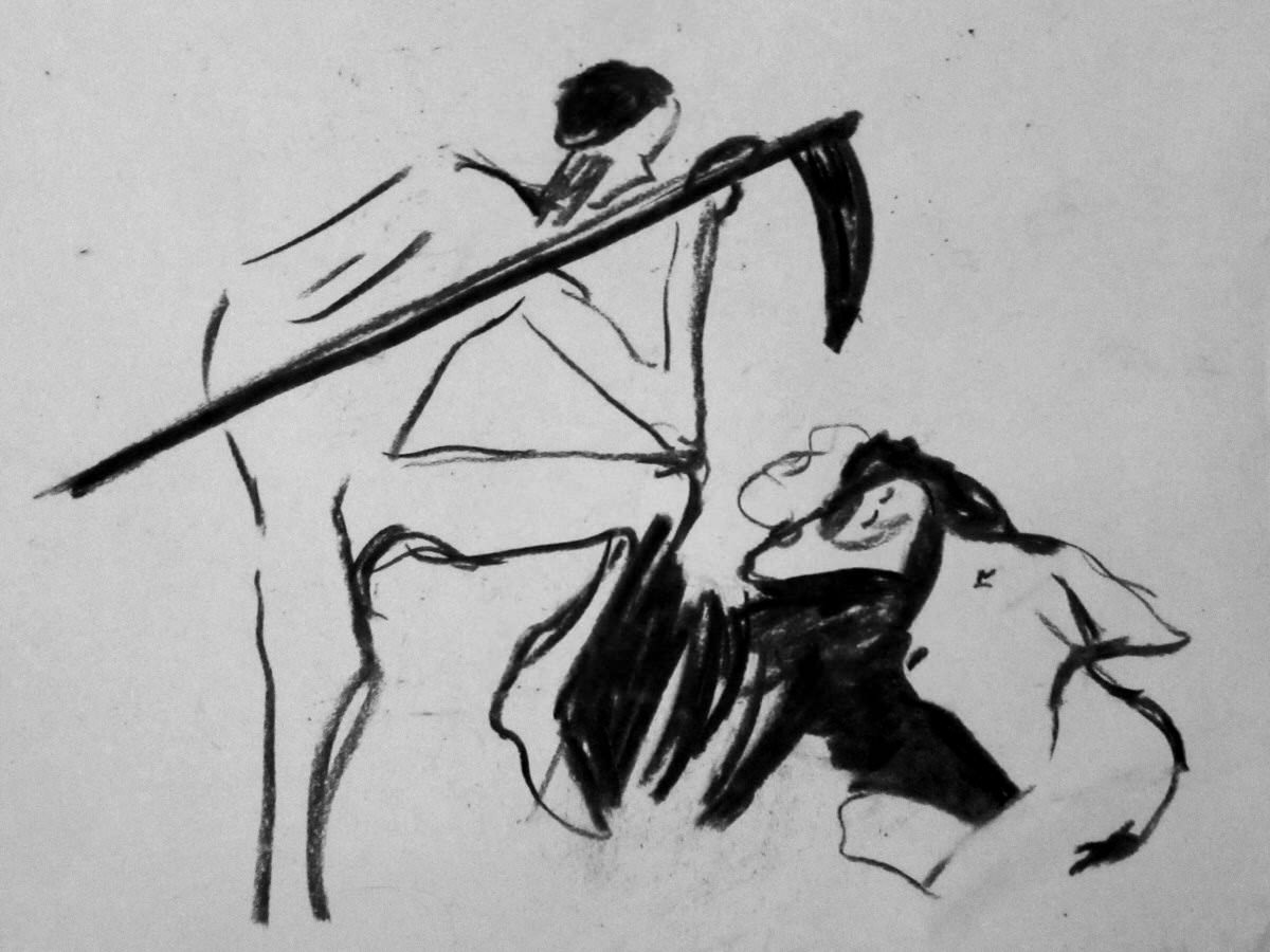 For 5-minutes we embraced in a twisted dance of death, each with one arm around the other’s body and our other arms high, holding hands. Next, for 7-minutes Esther feigned sleep while I hunched over her in sinister fashion, clutching a scythe. Finally in this sequence, Esther was seated for 10-minutes while I stood behind her, holding one of her arms; it was to remain ambiguous whether I was pulling or she was reaching.