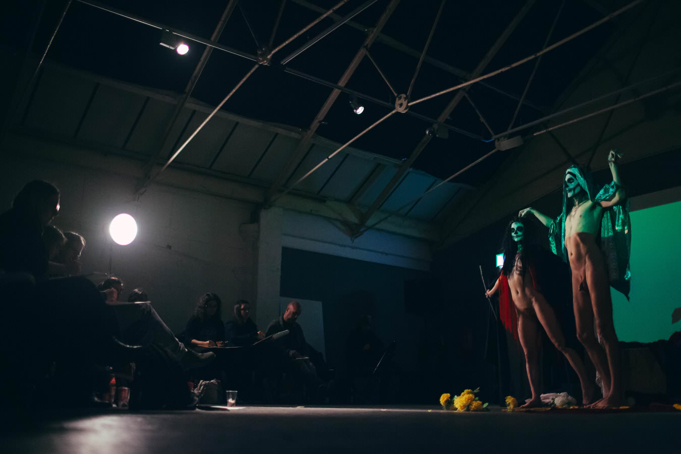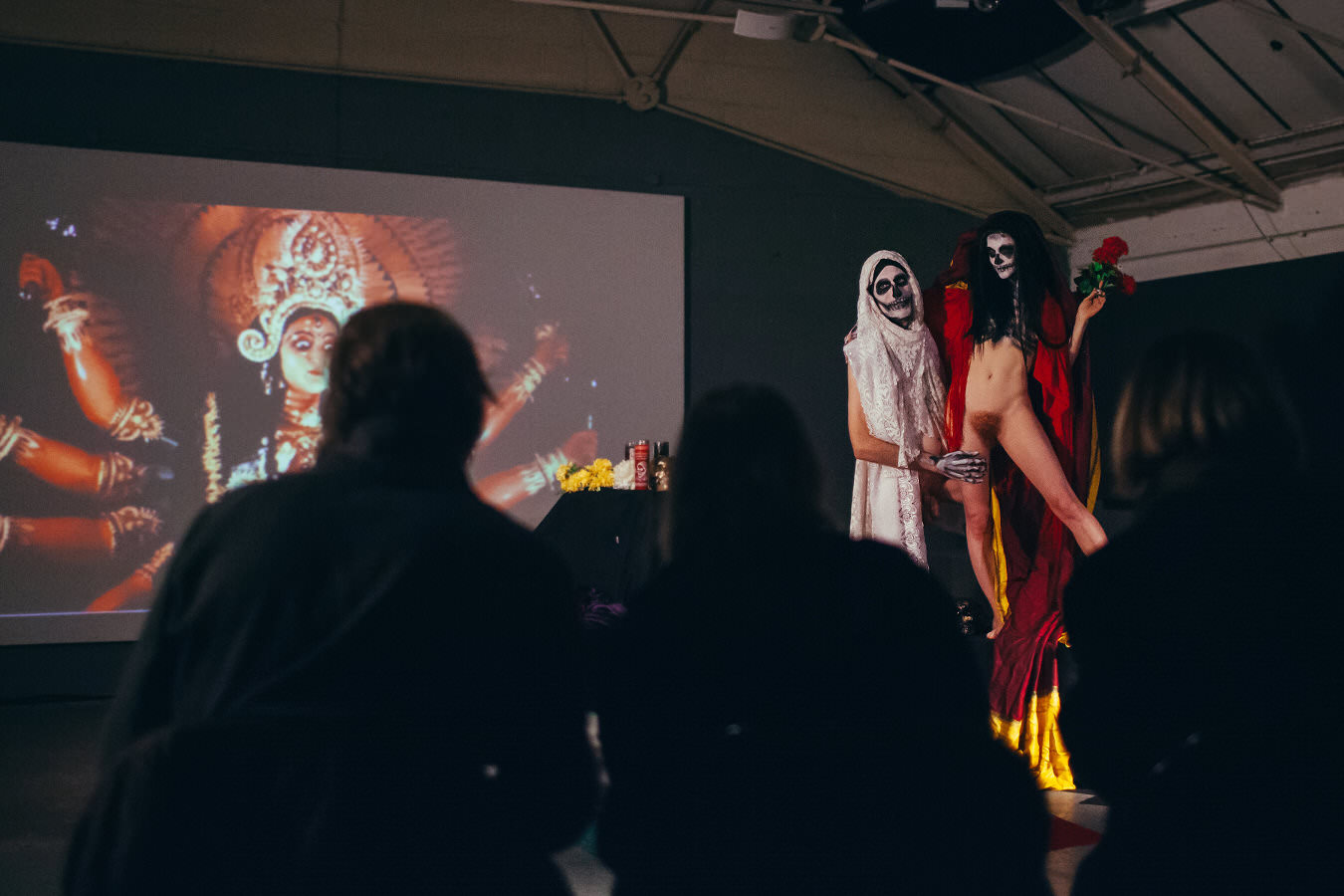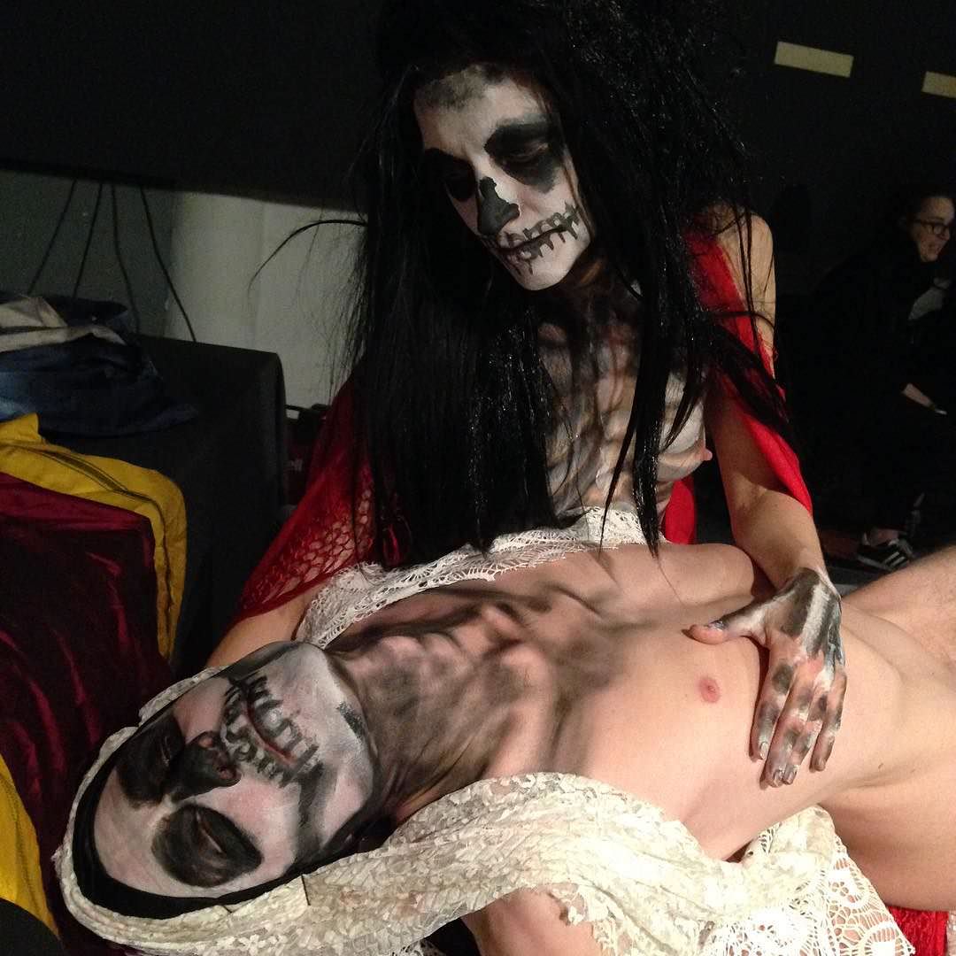 In the cold concrete kitchen of a former warehouse on the east side of Birmingham, Esther and I huddled naked around a small sink. We doused our faces, necks and chests with barely-warm water until, after repeated soaping, splashing and shivering, we had removed the last traces of body paint. We were chilly but happy. Our painted skin had been skeletal… we were once more on assignment for Art Macabre.