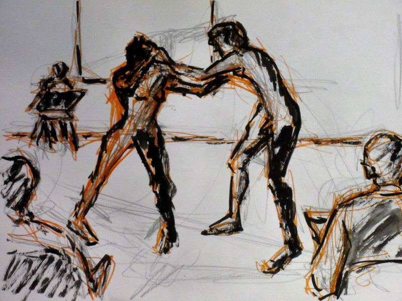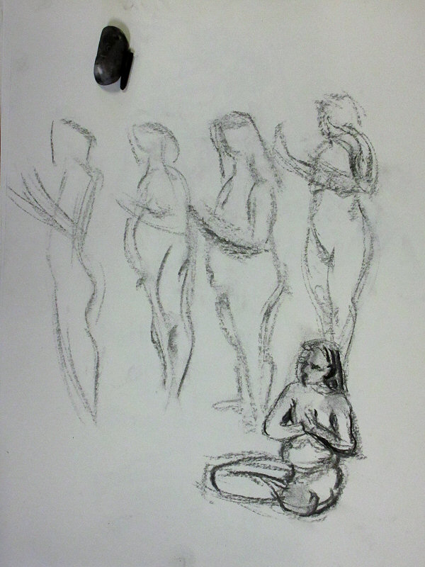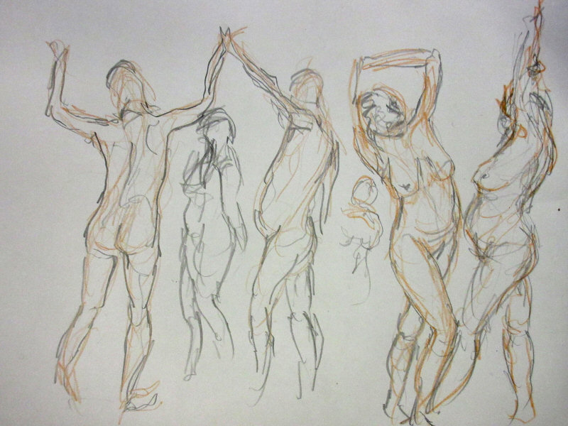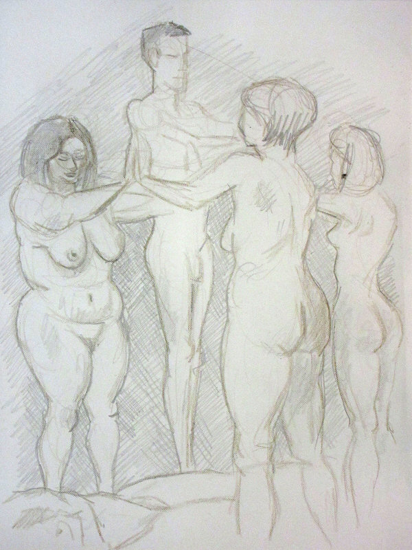 Heart would be a movement pose. Four of the models lined up in pairs behind Esther, who had returned naked to the group and would be spearheading its action. As Sarah drummed a rhythmic heartbeat, the five upstanding models slowly, slowly raised their arms high, then lowered them to their hearts. This was repeated over and over for the full quarter of an hour whilst artists captured their transitions.