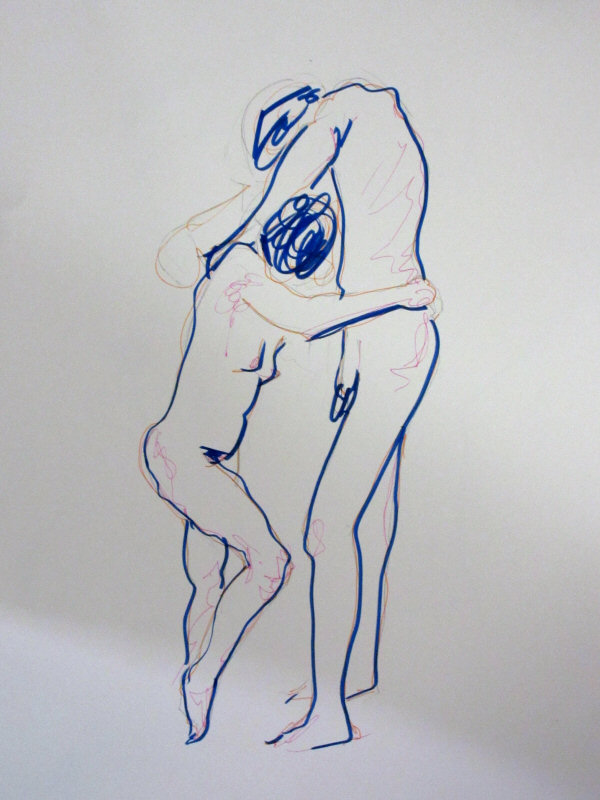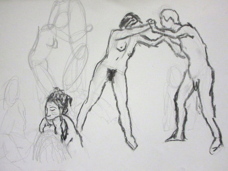 Our final pose was to be 15-minutes freestyle. Sarah returned to her gongs and bowls, another female model decided to try drawing, so the remaining three women and three men paired-up and settled down. Two of the couples were in genuine relationships; the others simply seized the moment. I leaned back into cushions, cradling Esther gently in my arms, and we lost ourselves as one in time and space.