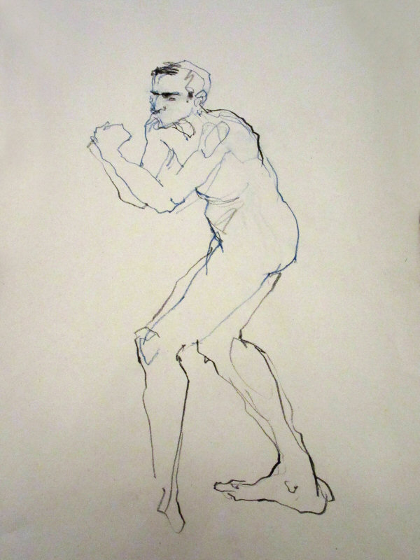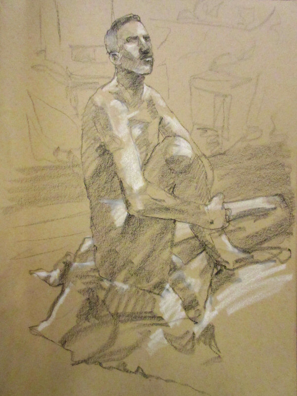 There can be few sights more welcome to a life model in winter than that of a roaring fire next to their pose space. Upstairs at The Sun in Clapham, the flames were not exactly roaring, but even a gentle flicker in the grate is enough to warm the heart. A bumper turn-out of around 20 artists helped warm the rest of the room.