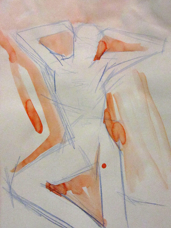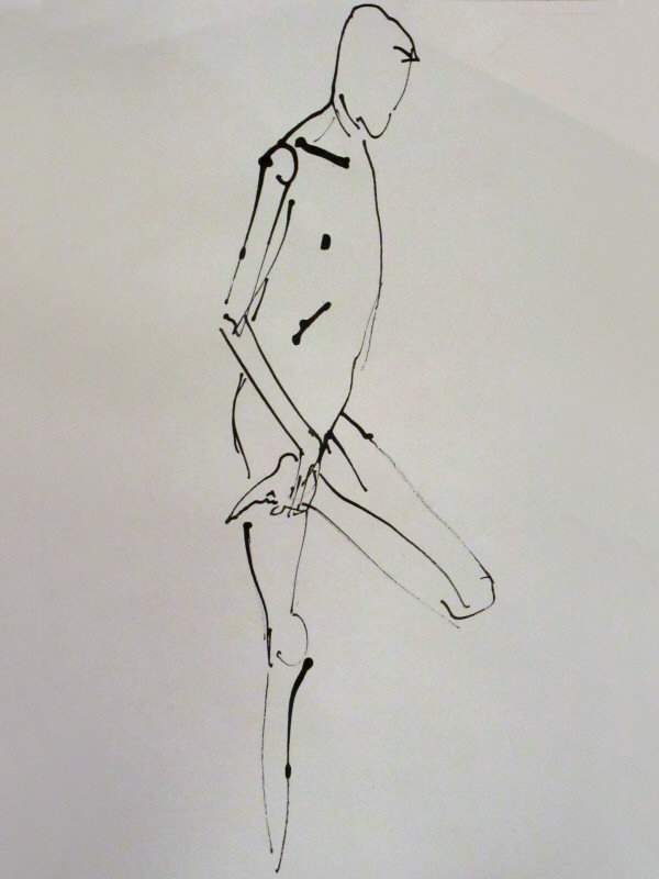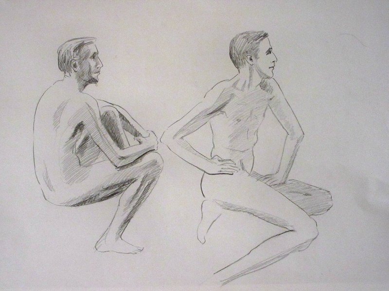 As is the tradition, works were set out upon the floor at the end for general admiration. Everyone seemed pleased with the evening’s efforts, and I joined most of the artists in staying afterwards for a swift drink. Having posed here just three weeks before, I didn’t expect to be invited back so soon, but it’s always enjoyable modelling for a group that appreciates a particular style of dynamic pose. I’m happy to oblige.
