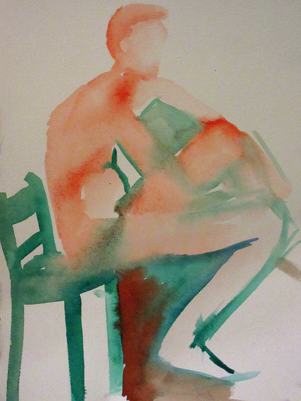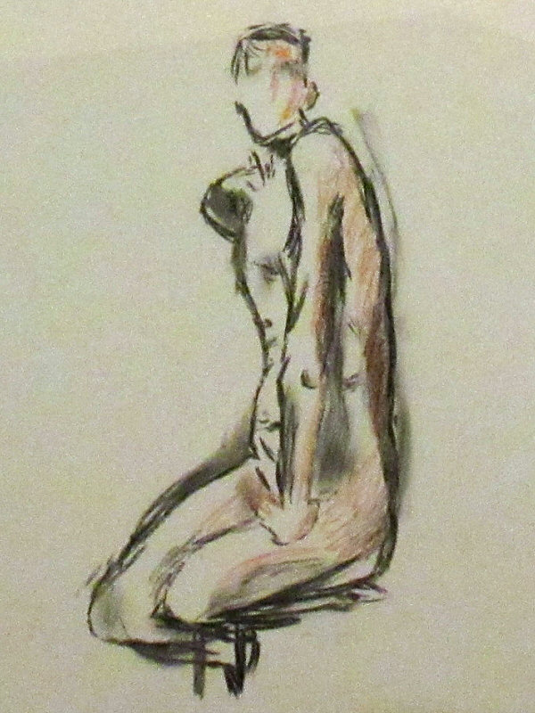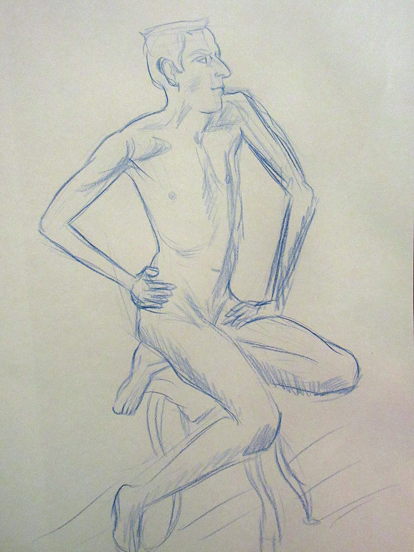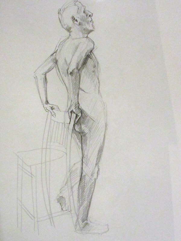 I was to be modelling upon a high stool, a mid-height chair and a low stool, switching positions on one or more of these throughout. The pose sequence was: 5-minutes, 4, 3, 2-minutes, then three of 1-minute, three of 30-seconds, and two of 10-minutes that brought us to an interval. After our break for refreshments, we resumed with poses of 15-minutes and 10-minutes.