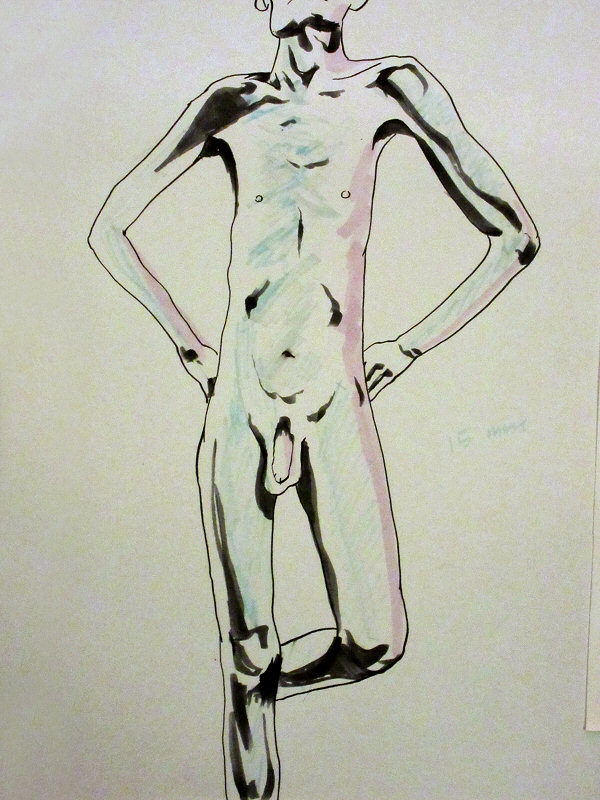 This was my sixth time modelling here, and the busiest I’d seen it. Usually there are around half-a-dozen people drawing, plus Catherine and Carla – all good artists – but tonight there were fully eleven present with the two organisers. To accommodate the extra people, I was meant to be posing in the round rather than facing a semi-circle, but in practice it was something in between; artists settled into a three-quarter circle.