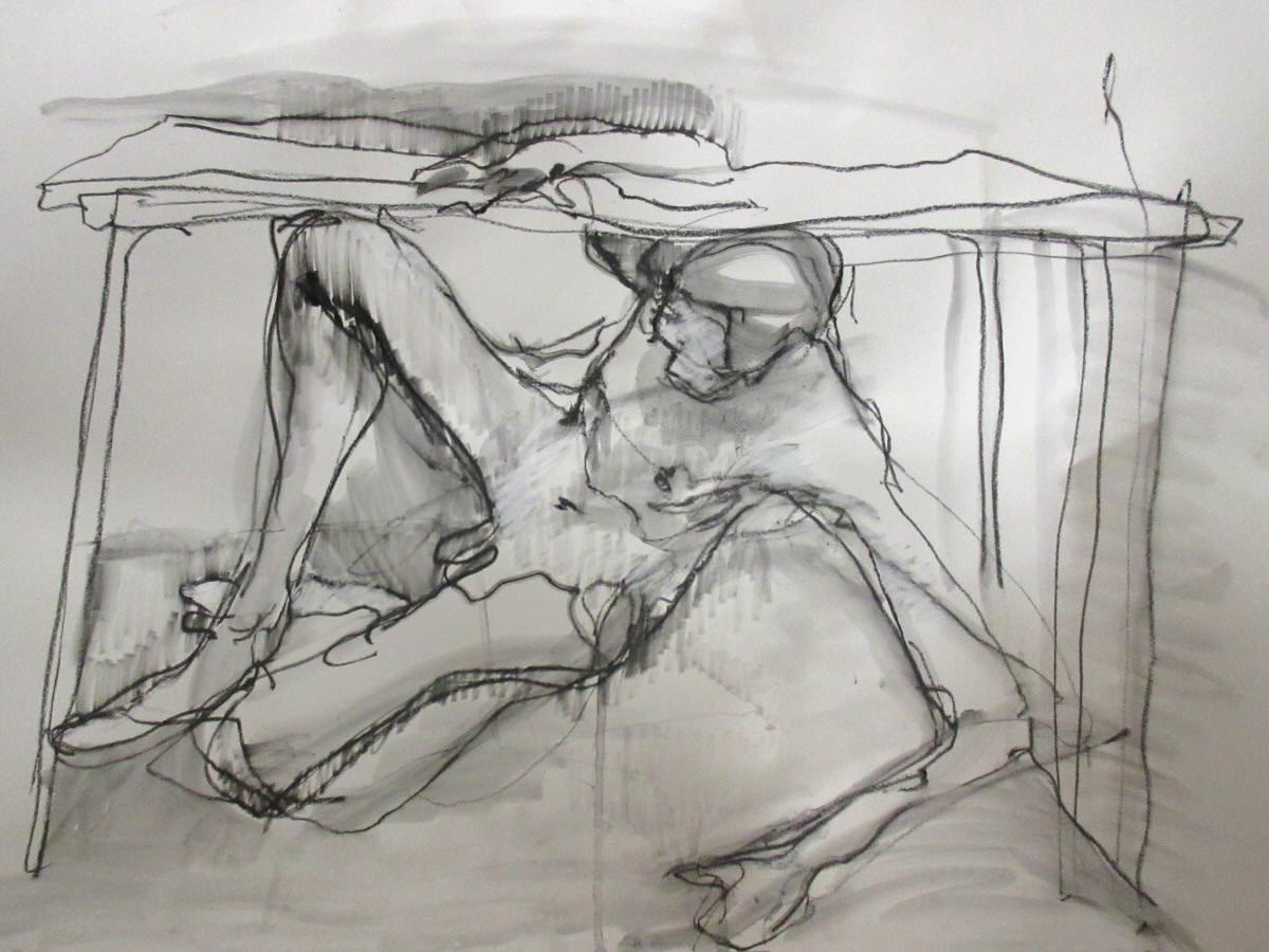 To begin with, I stood side-on to the table and twisted my torso to arch across it, holding both edges. Next I stood at the opposite side, with one knee on the tabletop. Gillian had specifically requested one pose be beneath the table; when I obliged, she asked if it could be for 15-minutes. No problem. The final two 10-minute poses – one seated entirely upon the table, the other perched on one side – were also lengthened to 15-minutes midway through, with my consent.