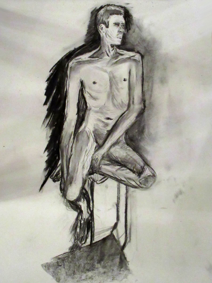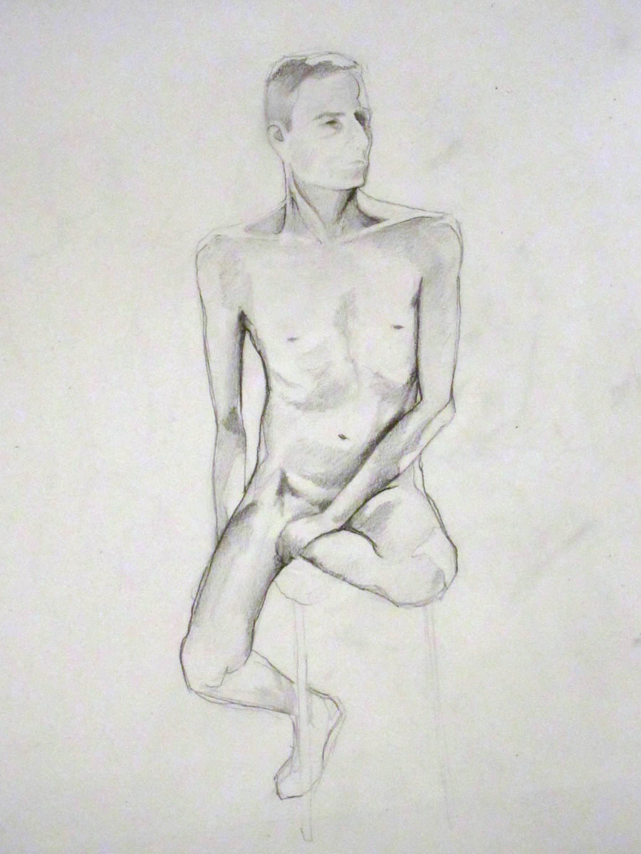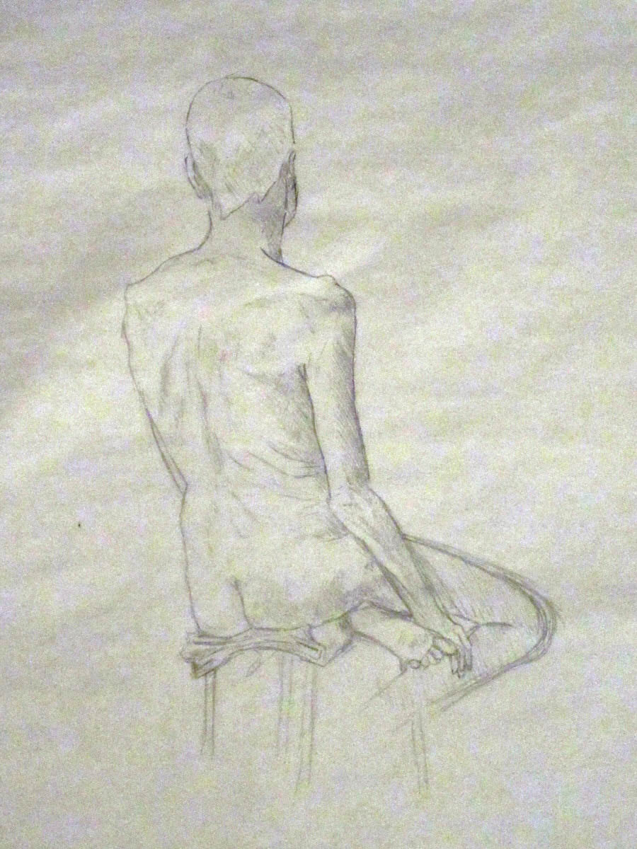 It wasn’t all tedious, though. To begin with, a series of short poses was requested as a warm-up for the artists. I went 5-minutes, 5-minutes, 5-minutes and 7-minutes, all standing, alternating direction each time. Then came the long one. I chose a seated pose on a low stool, with my left leg crooked beneath my body, my right leg hooked backwards with toes on the floor, and both arms passive. Not comfortable, but OK.