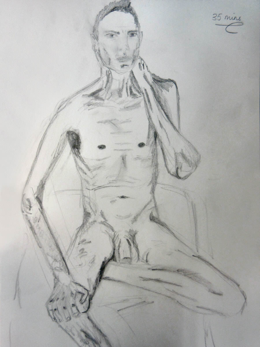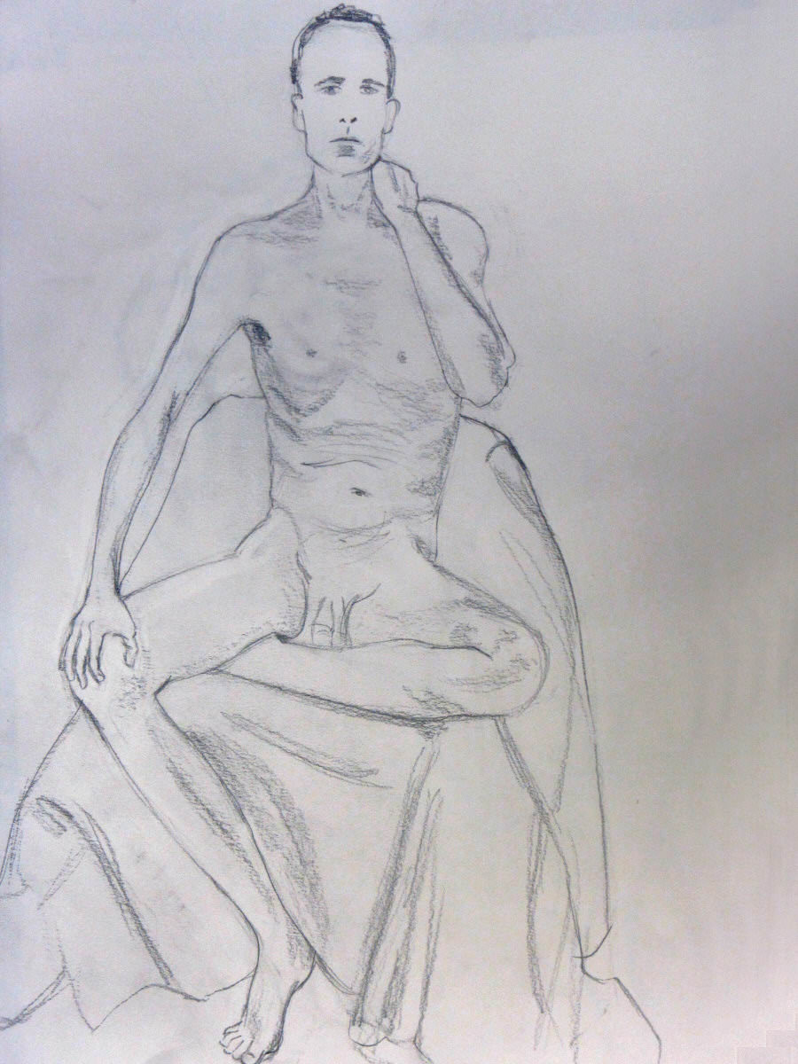 The thigh-clasping pose left me with a delightful array of pink blotches on my arms, my legs and even where my forehead had been pressed on to my knees. I flaunted these colours over the next half-hour in an angular seated pose that took us to the midway interval. When the artists returned from their extended tea break, a single 35-minute semi-reclining pose took us to a finish.
