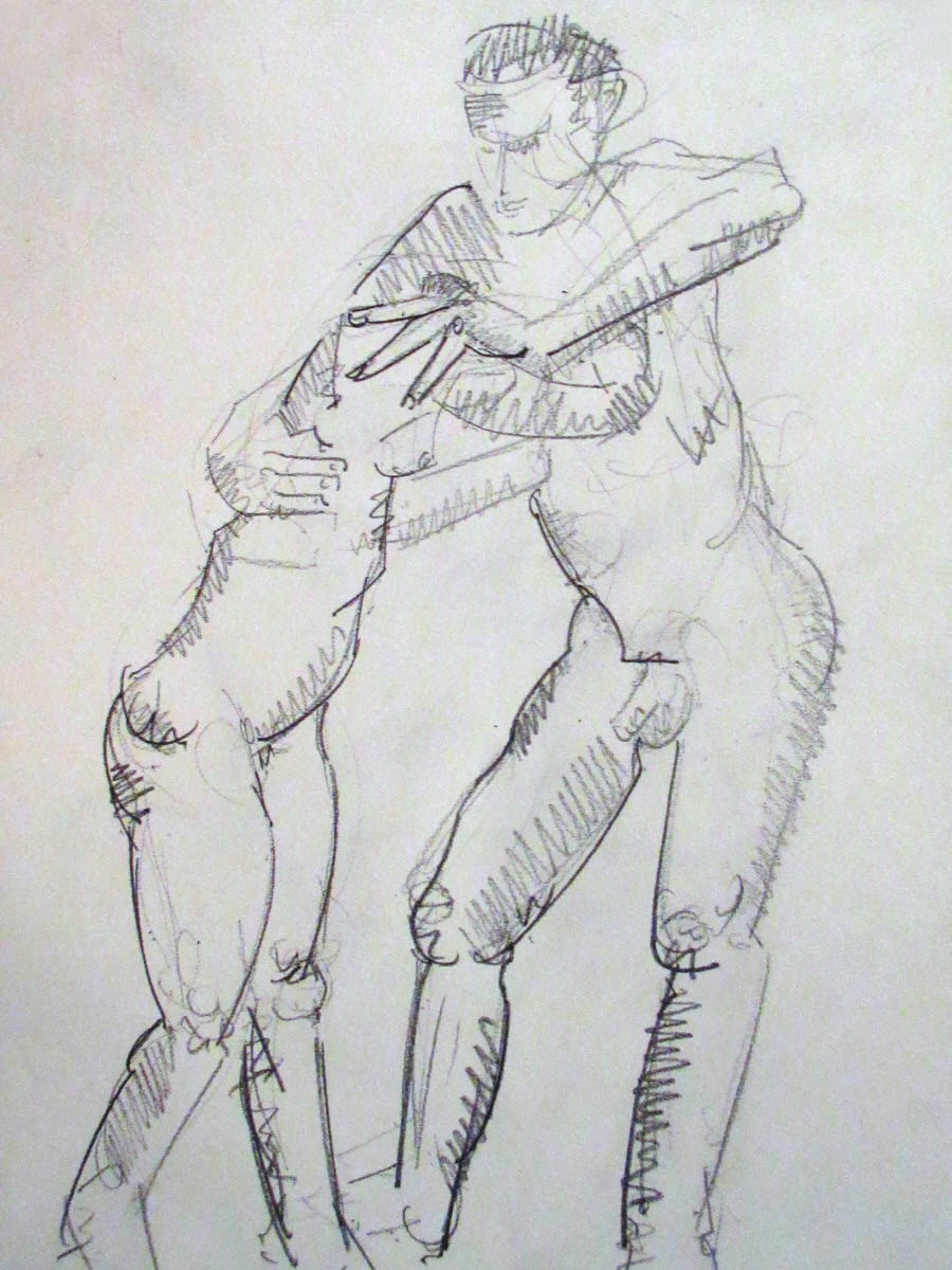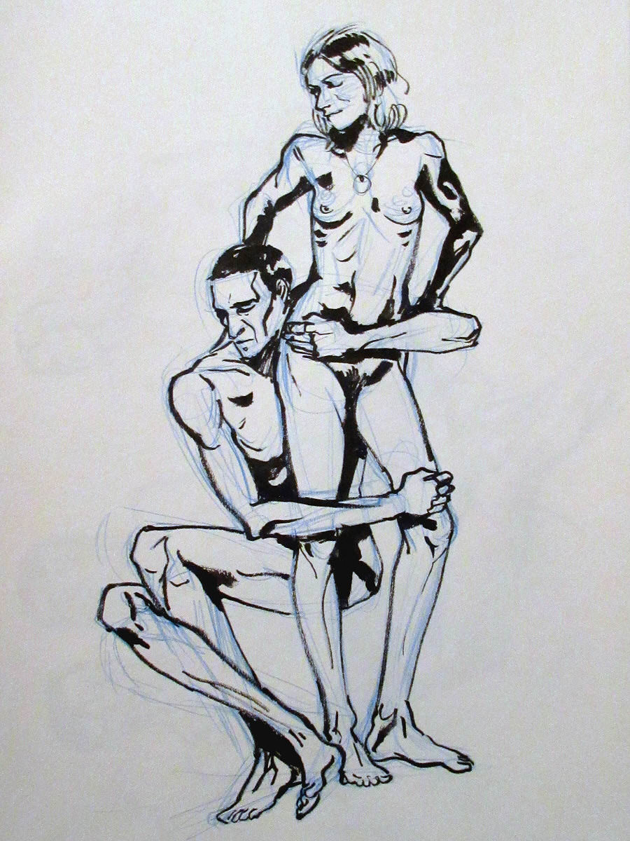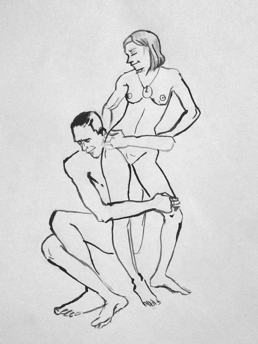 The session was billed as ~LONG Poses~ but in practice this simply meant no quick dynamic work. In the first half we would be posing for 15-minutes, another 15-minutes and 30-minutes. Most of our recent duo work has been cosy and gentle, so for variety we decided to start this one with us both standing and our hands upon each other, as if locked in some kind of struggle.