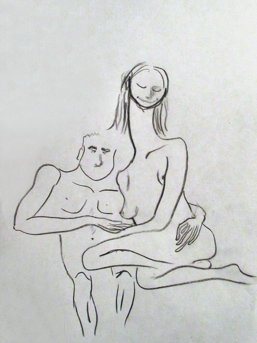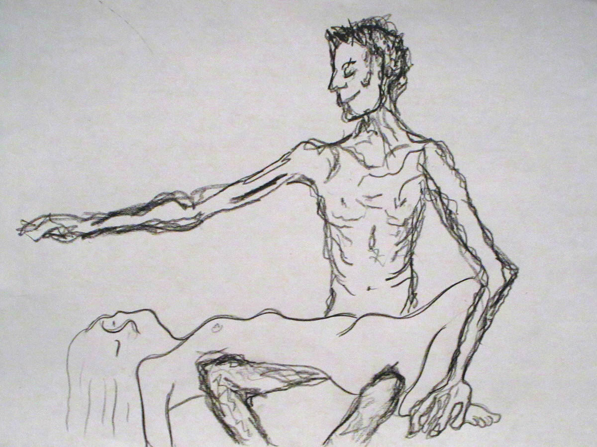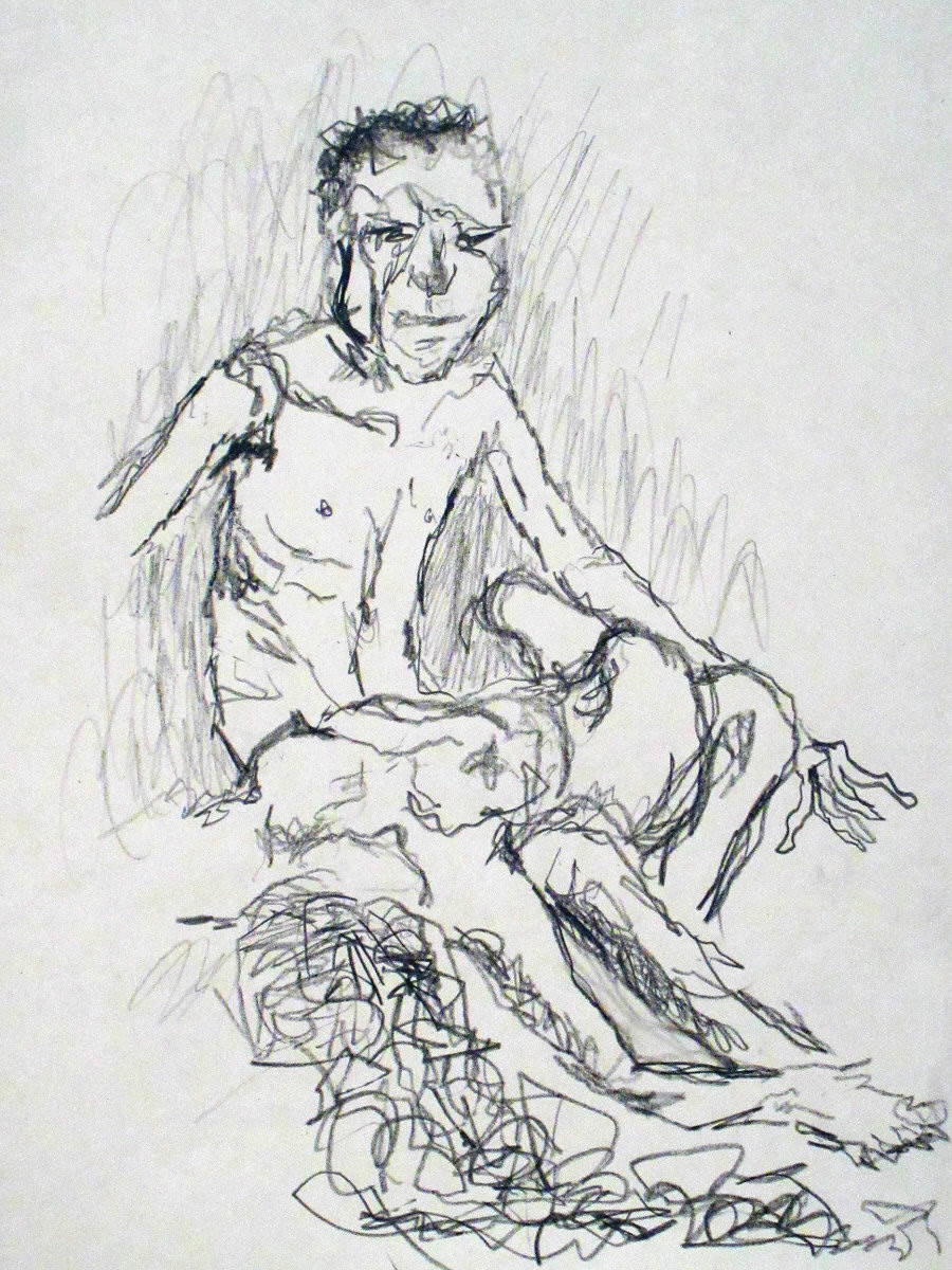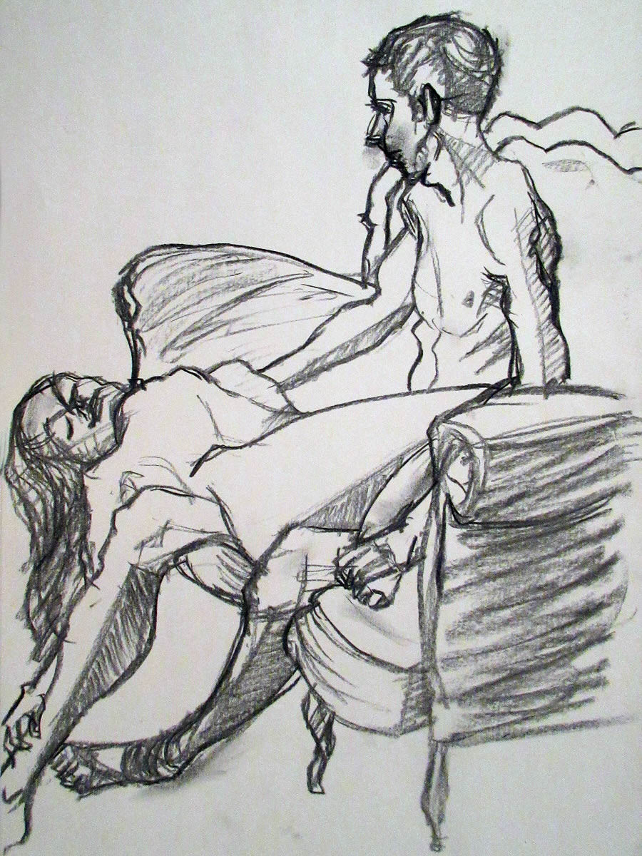 For the second half, artists were asked whether they would rather have one 45-minute pose or two 20-25 minute poses. Apparently they usually choose the latter so we had already got our first pose worked out for it – a kind of role-reversed Pietà. Needless to say this time they preferred the single pose. We stayed with our idea but it was a real strain for Esther. She did tremendously well, even with a break to stretch.
