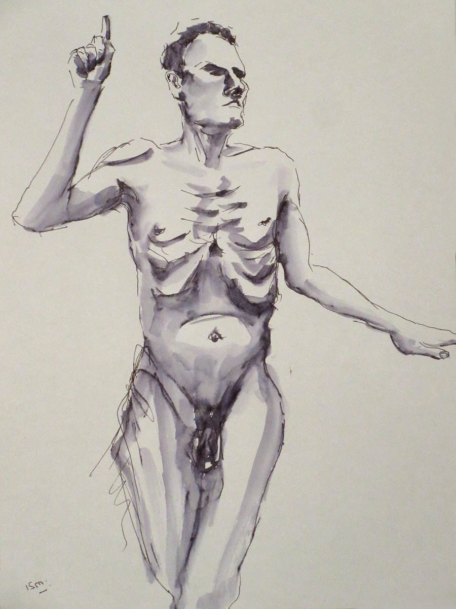 I’d begun with five 2-minute poses, continued with two 10-minute poses, and finished the first half of the session with three 15-minute poses. A fourth 15-minute pose after the interval preceded the two long closing poses, described above. Thirteen poses in three hours had allowed for plenty of variety, and resulted in some good quality art. I look forward to a second visit in mid-July.