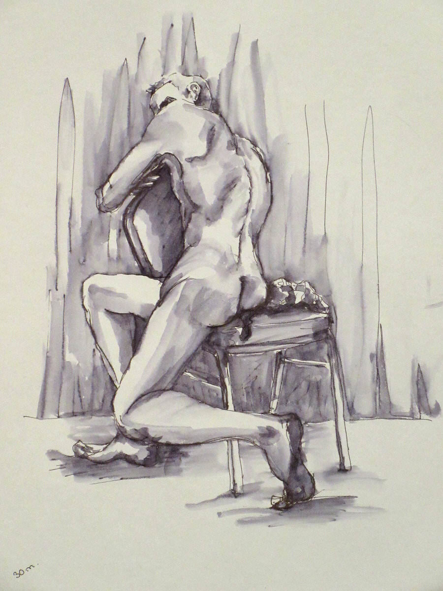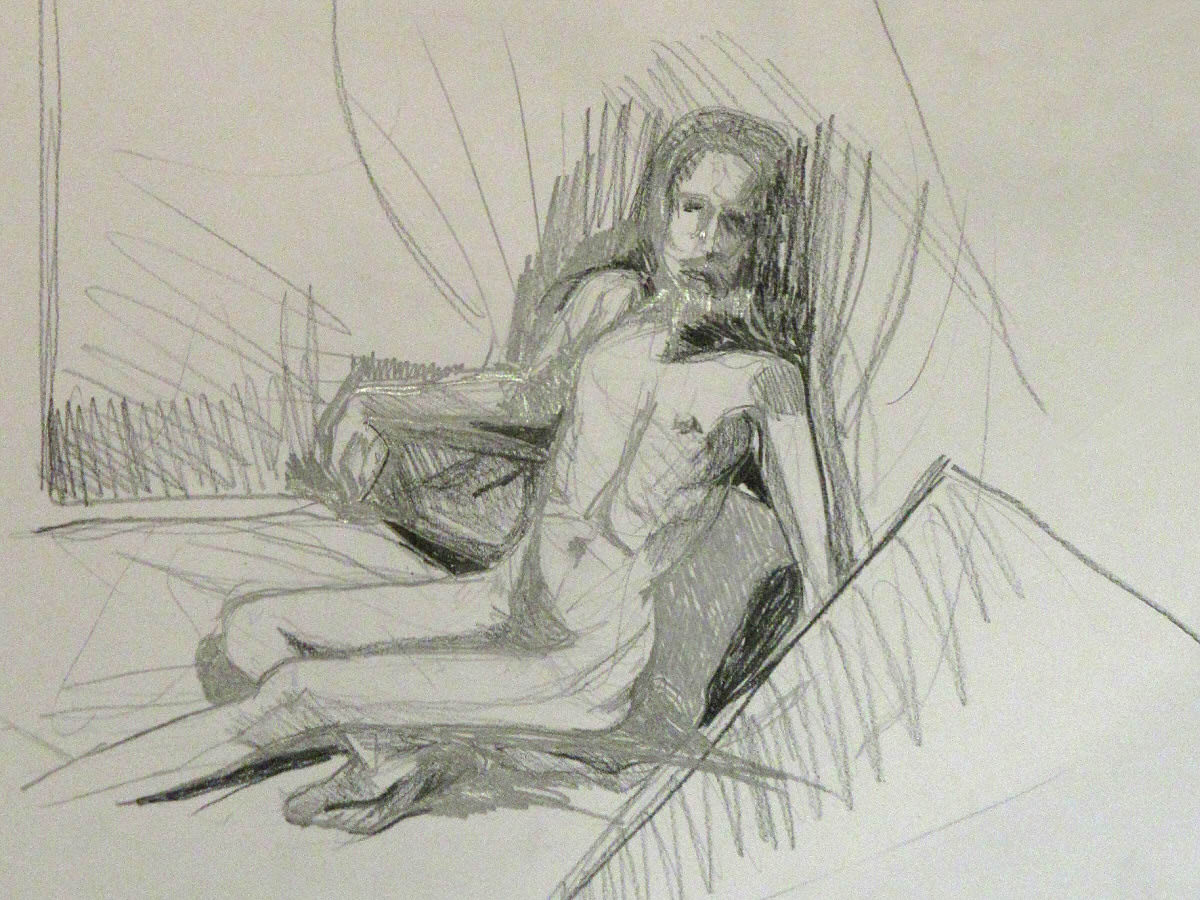 “Perhaps you might indulge me to try something a little less strenuous?” My humble plea elicited chuckling and murmurs of consent all round. Upon request I’d spent the previous half-hour sitting side-saddle on a chair with my back to a horseshoe of eight artists; my face rested upon my folded arms on the chair’s back, while my body was partially twisted to face those drawing me.