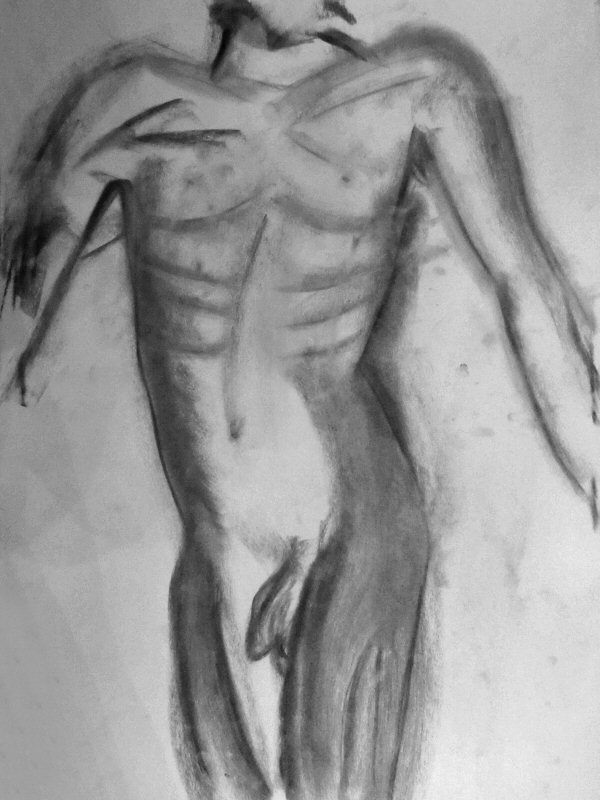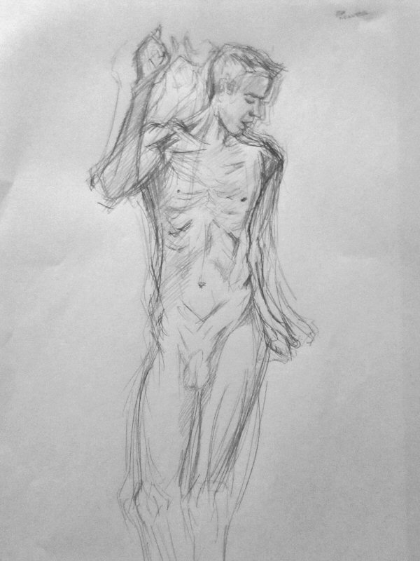 Julia looked in unexpectedly during the interval, which was nice, but all was going well with Edward at the helm. She set us straight that the final pose should be 30-minutes rather than 45, and I felt inspired to close out the session standing. Afterwards, I took photos of drawings and, as always here, enjoyed having a chat and some laughs with the artists. I very much look forward to returning here at the end of June for duo poses with Esther. It remains one of my favourite places to model.