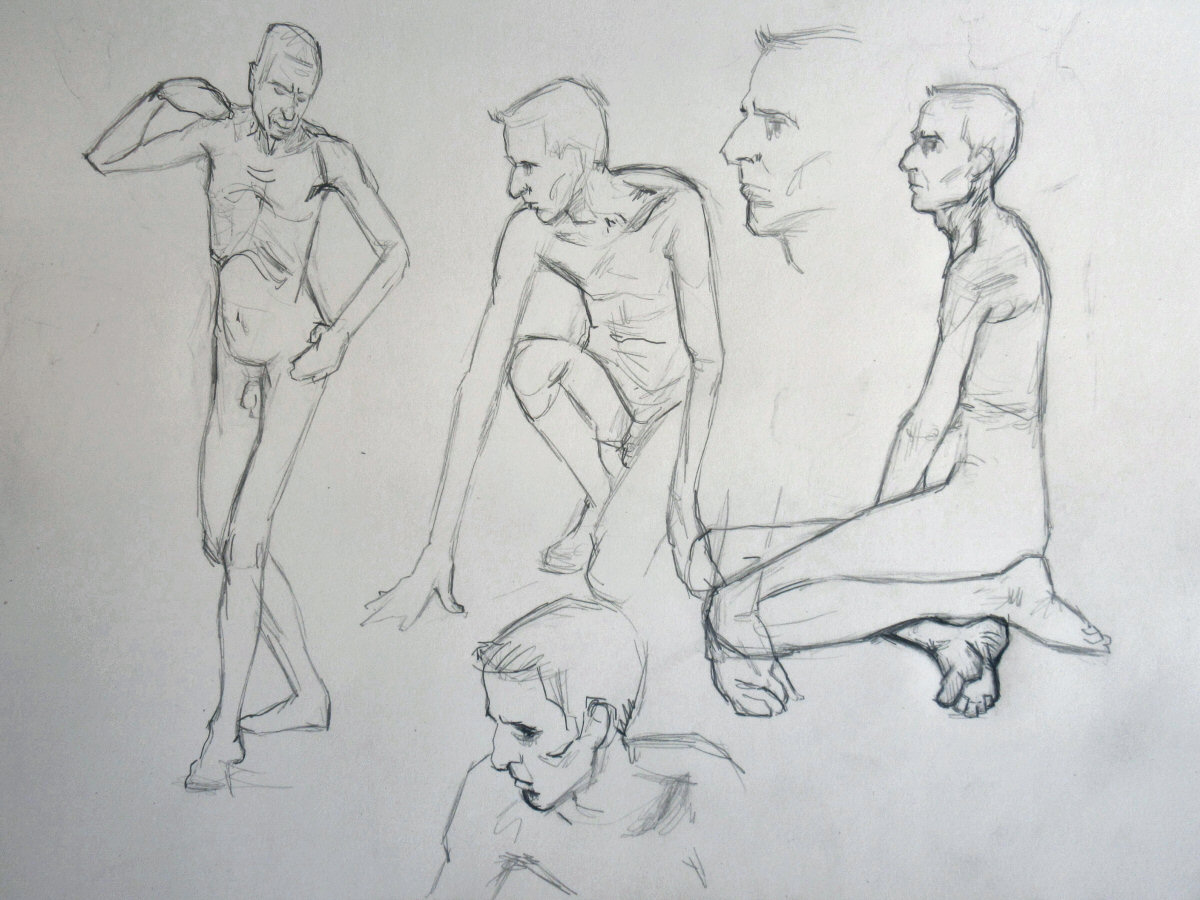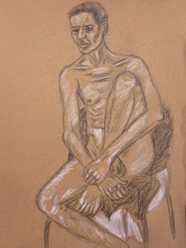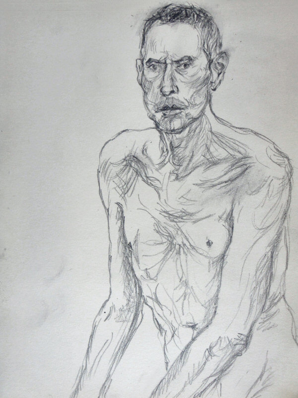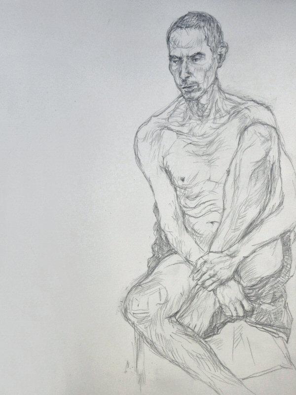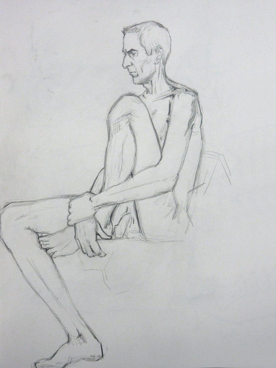That aside, it was an enjoyable session. In the first half I went 5, 10, 15, 20-to-30-ish minutes, flowing from standing-stretching, to standing-lower, to kneeling, to sitting on the floor. After a tea break I was sitting on a chair with one of my feet on its seat for a single hour-long pose. Last time I modelled here I shared body warmth with Esther. My next booking here is in August, by which time hopefully we can rejoice in summer heat with open windows.