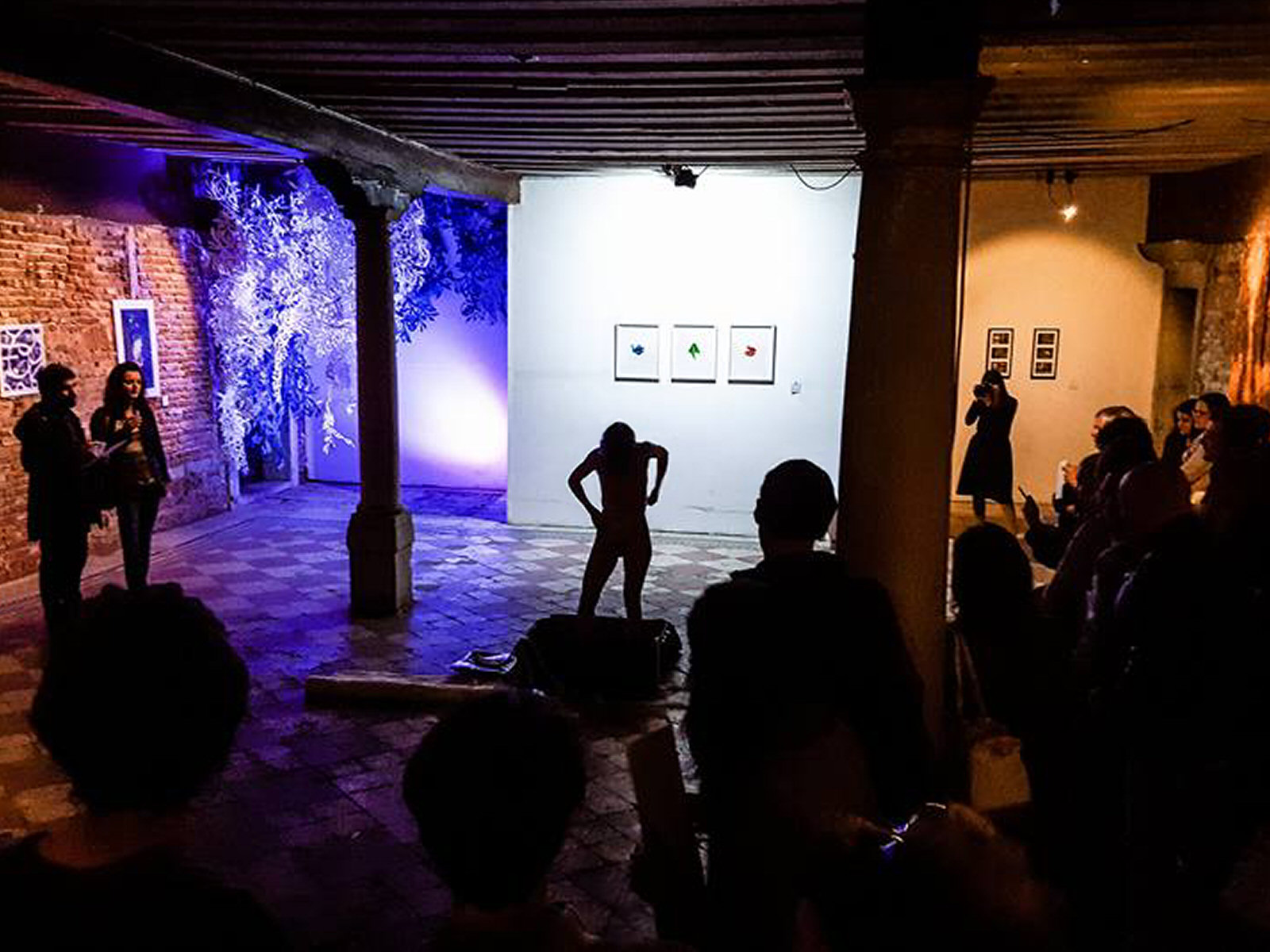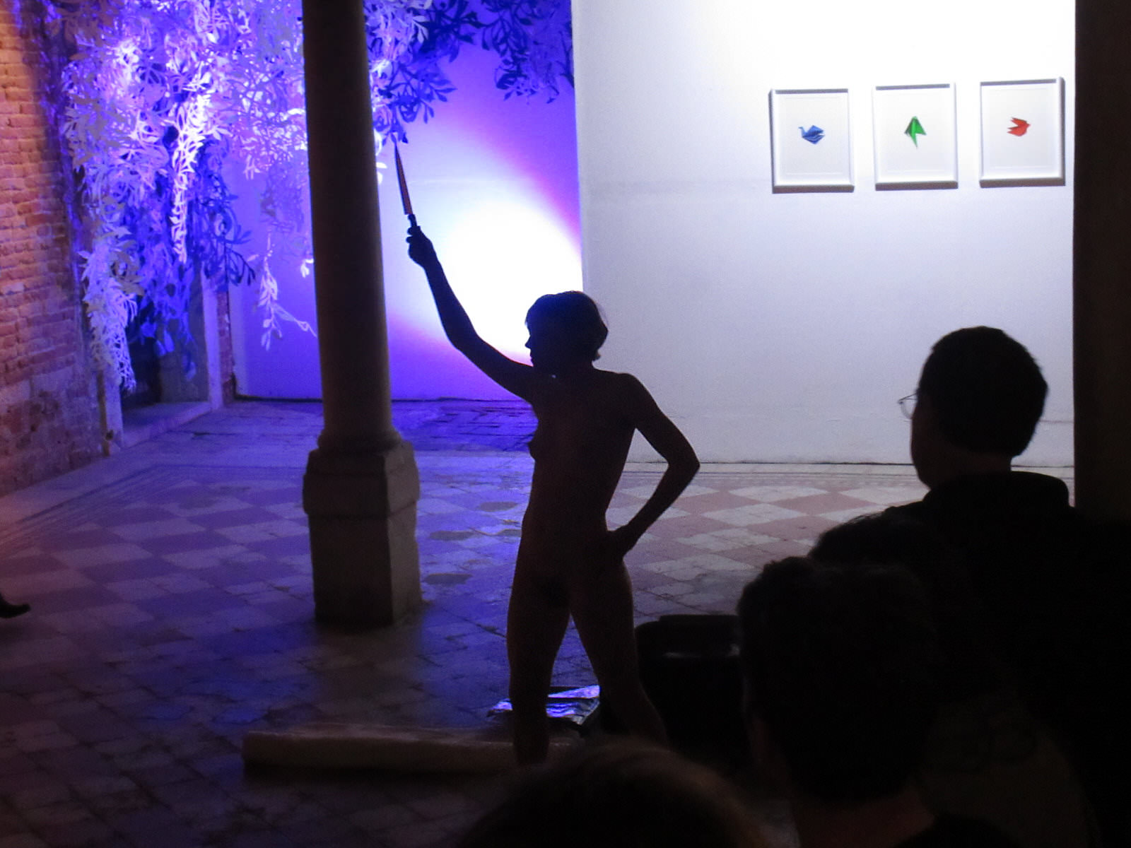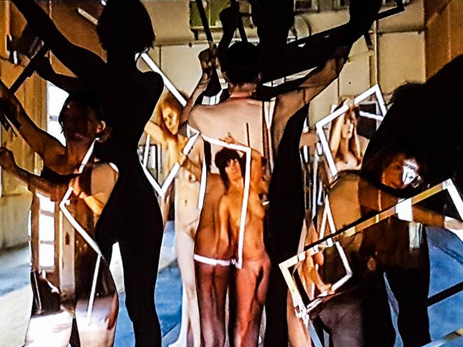 When the gathered mass of art lovers had hushed, the three of us stepped forth, each holding an empty white picture frame. I stood centrally with my back to our audience; Glynis and Esther faced outwards, such that we were aligned at 120° angles. As the video and music of a previous Mobilé performance projected onto our naked skin, we lifted the frames and plied them in gentle motion. The piece lasted 10 to 15-minutes and felt wonderfully serene. I had a superb view of shadowplay on the wall behind us.