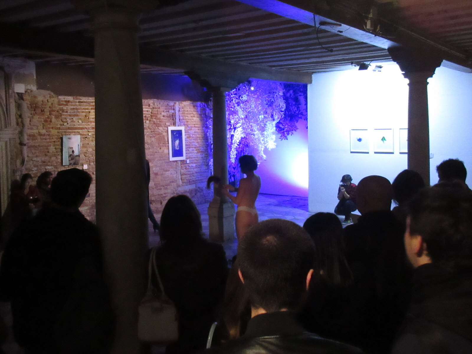 Relaxation continued into Saturday as we passed the time idling and writing near the Sant’Elena end of the island. By evening, however, as we arrived at Cà Zanardi for the performances, I was starting to feel a little tension. Not nerves, but a strong sense of responsibility and a desire to make the best impression. Glynis found us before 6pm and gave us a very short run through the moves for Mobilé. In no time at all, we were undressing beneath the blue and white paper art of Veronica Hodges.
