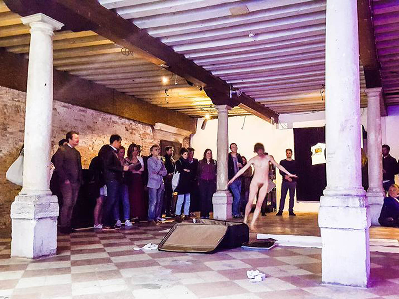 Late next morning, we boarded a vaporetto from Arsenale to Fondamente Nove with our heavy loaded suitcase for Esther’s performance. We found the Cà Zanardi team busy with their preparations for opening night, but they allowed us time and room to have a full (clothed) rehearsal. I was given an area in one corner to set up our laptop and speaker for music, whilst Esther took centre stage on the ground floor between four pillars. The space and the acoustics were good. We left in a mood for posing.