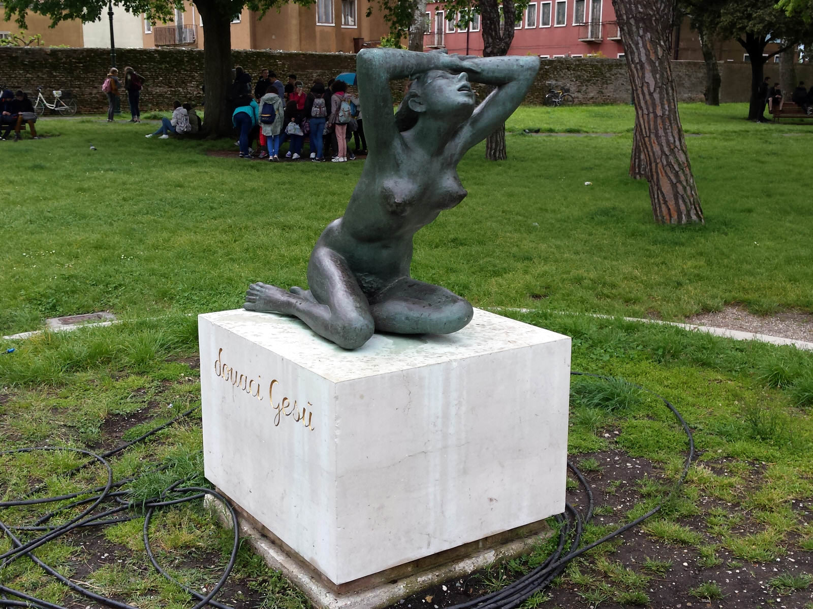The performance was refashioned from Girl in Suitcase at the 2016 Telegraph Hill Festival with two main differences: first, it had been cut down to 20-minutes from the original hour; second, Esther had learned all its lines in Italian. This incredible woman never ceases to astonish me. We had assistance in the form of Veronica, who would hand out life drawing materials to the audience, but otherwise we were self-contained. As the crowd bustled below, I joined Esther to wrap her in bandages.