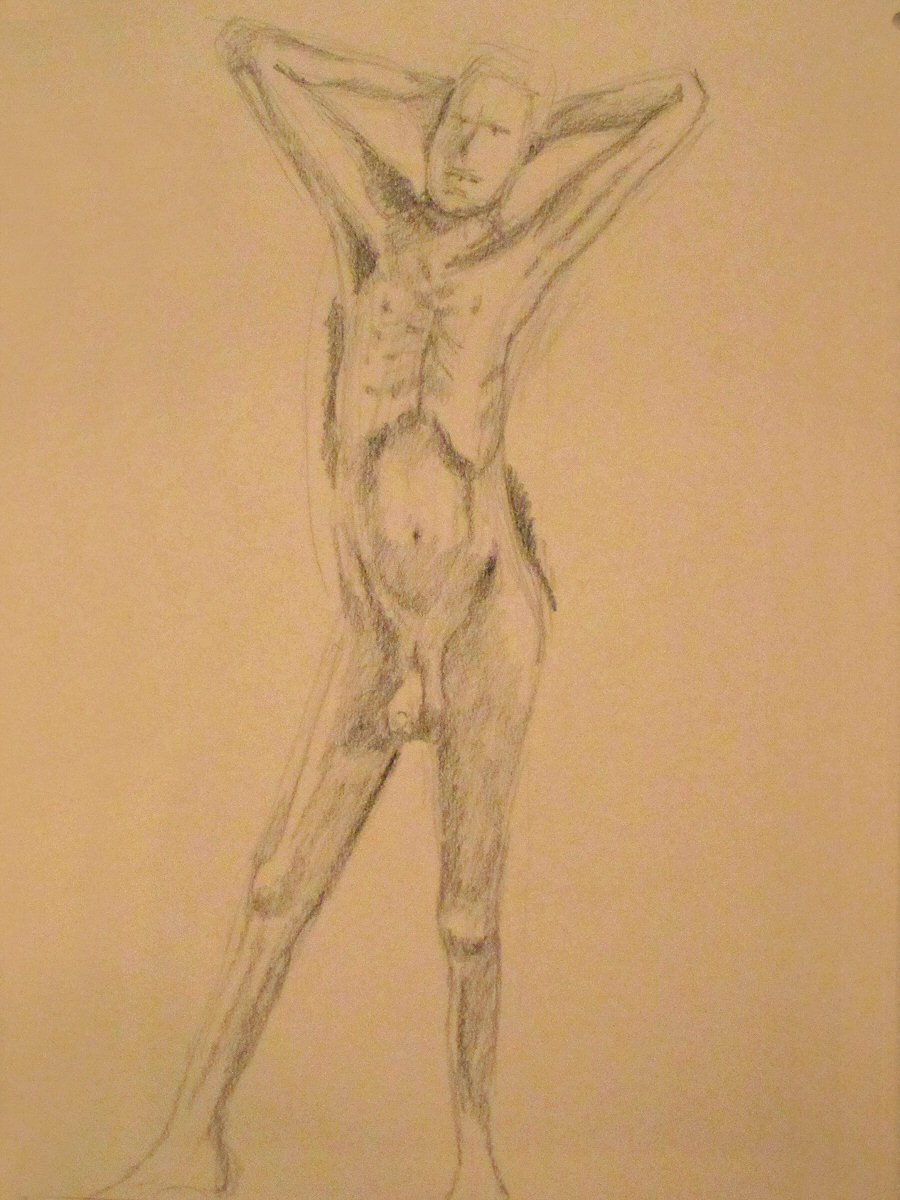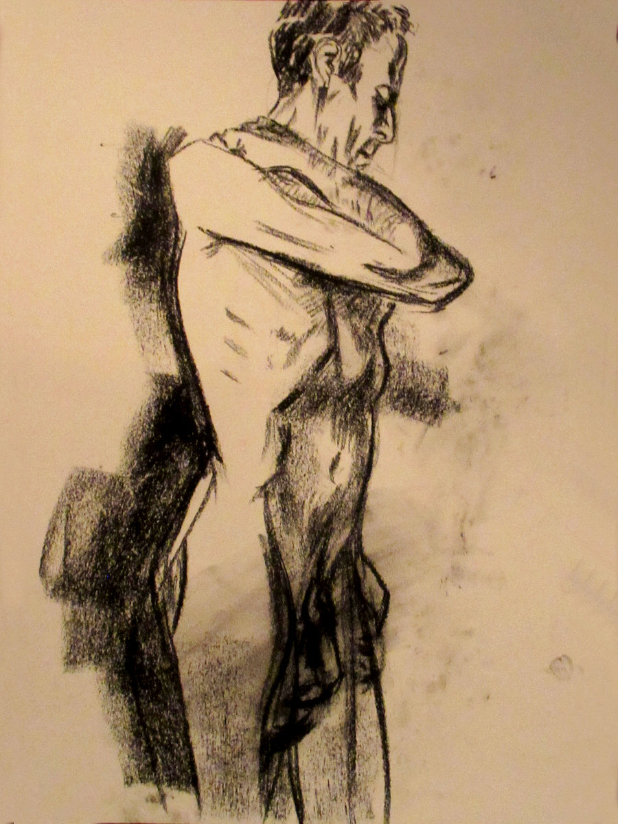 Three months on from my first visit to Bridge House, I was back posing for Anerley and Penge Life Drawing. It being mid-springtime, our natural light lasted longer, the ambient temperature was well warmer, yet the ambience of the room was every bit as friendly as it had been in late winter. Ten artists had come along to draw, and I was to present them long poses. “Long” in this instance is a relative measure as, rather than lasting hours, these poses would range from a quarter to half an hour.
