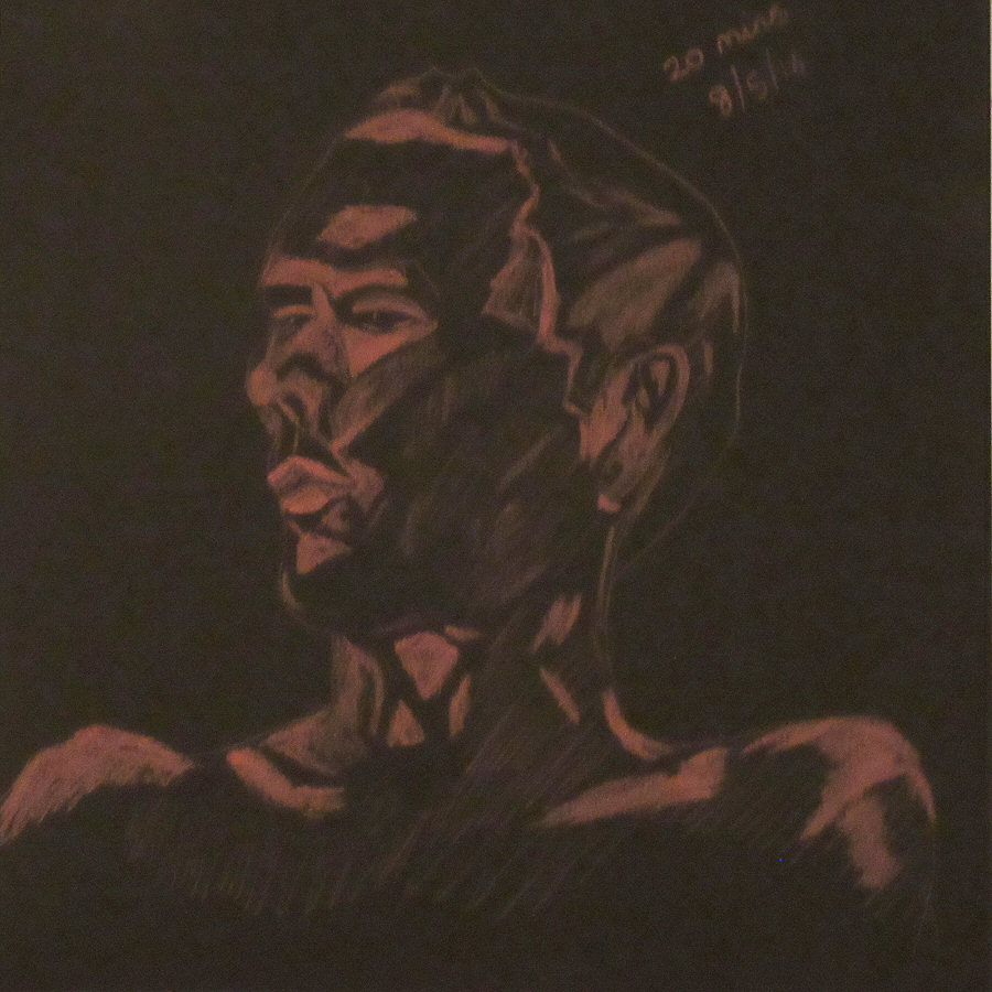 I began standing with hands behind my head for 15-minutes, then followed it sitting on the floor for 15-minutes with my face buried in the crook of my elbow upon a chair – a current favourite pose. After this I sat on said chair for 30-minutes, taking us up to the break. For the second half of the session I stood for 20-minutes with legs crossed and one hand on the back of neck, and closed the evening’s work with 25-minutes back in the chair, lounging with my legs across one of its arms.