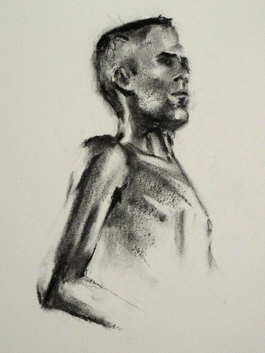 I smiled indulgently as I descended the stairs to where I would present four 30-minute poses. The young female model providing eight 15-minute poses was a professional dancer, so I ought to be grateful that anybody was drawing me at all. Setting aside self-deprecating paranoia, however, I am very aware how seriously this experienced society takes its art. I was grateful they had booked me, and that an appreciation of the human form extended, for some, to a study of my own unusual proportions.