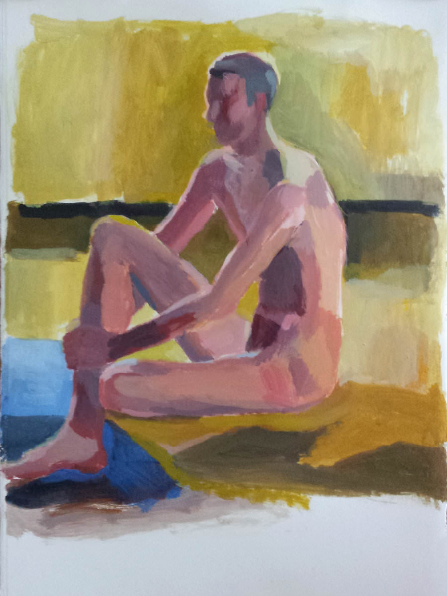 During this interval I felt immensely flattered when one of the artists asked me if I was a dancer. I replied that in the evening I would be going to a party, with dancing certain to happen, but this was the limit of my talents. After some pleasant conversation and a couple more digestives I resumed my long pose – sitting on the floor, as requested, similar to the long pose of my previous visit – and continued thus for 55-minutes, with one short break to stretch my limbs.