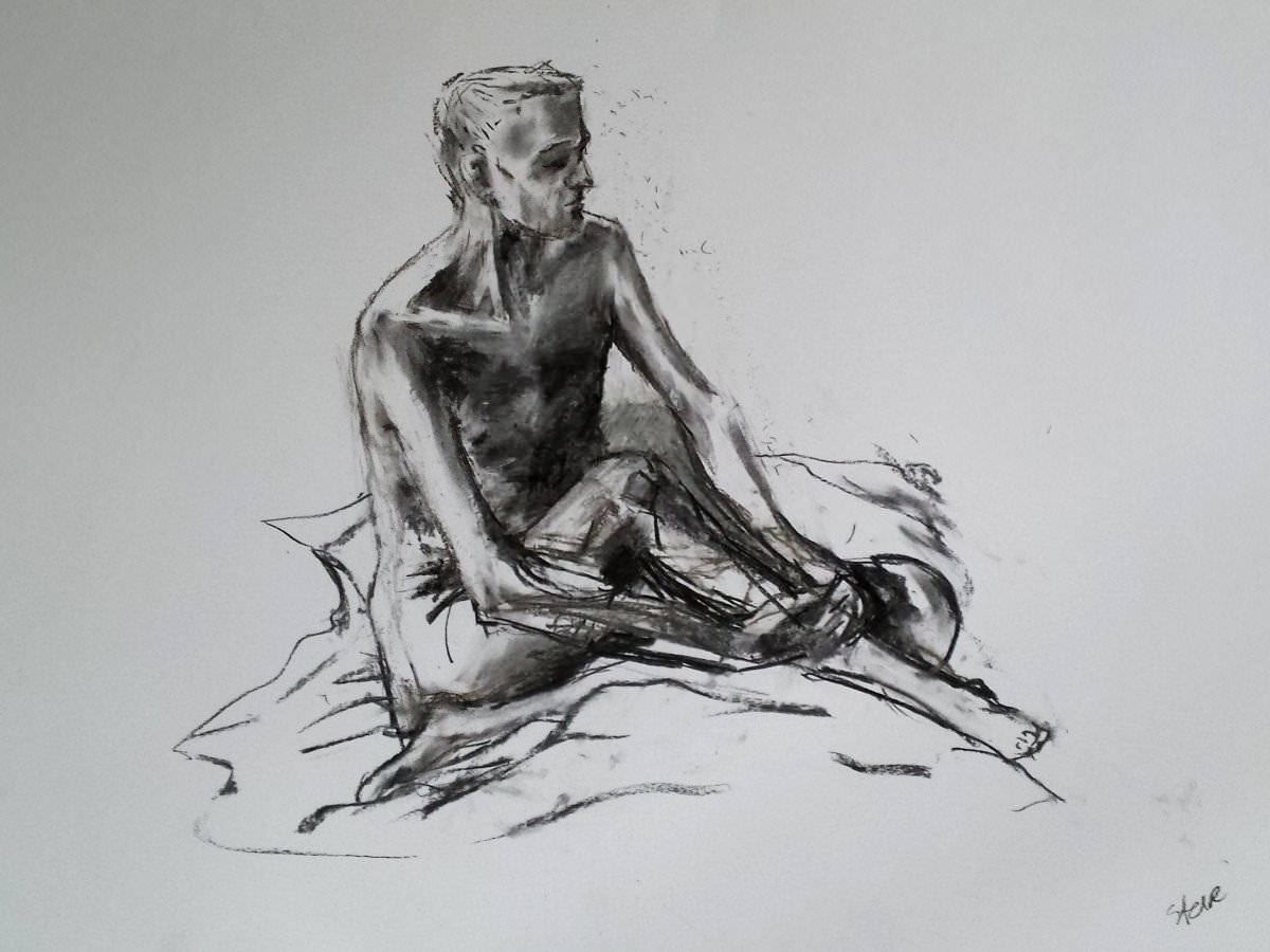 This was a 3-hour Saturday session, from 9:30am to 12:30pm. The three male artists slipped away separately in their own time, but those that went the distance had good work to show for it, and were positive in their feedback. I couldn’t stay chatting for too long, however, as that afternoon I was set to be cycling nude around London for about three hours – more of which in a later blog! For now, I just hoped I hadn’t over-exerted my legs in pose. The spring in my step as I walked away suggested all was well.