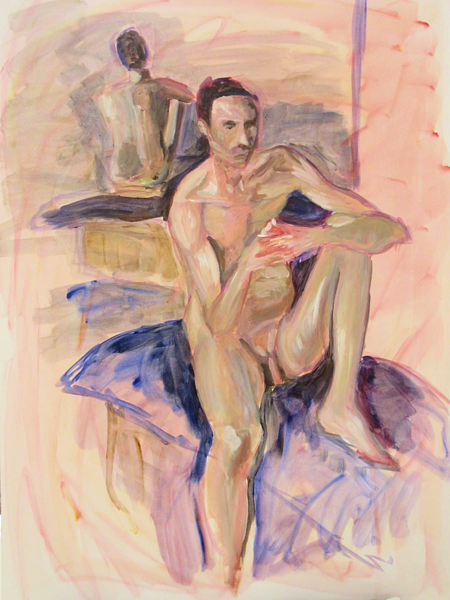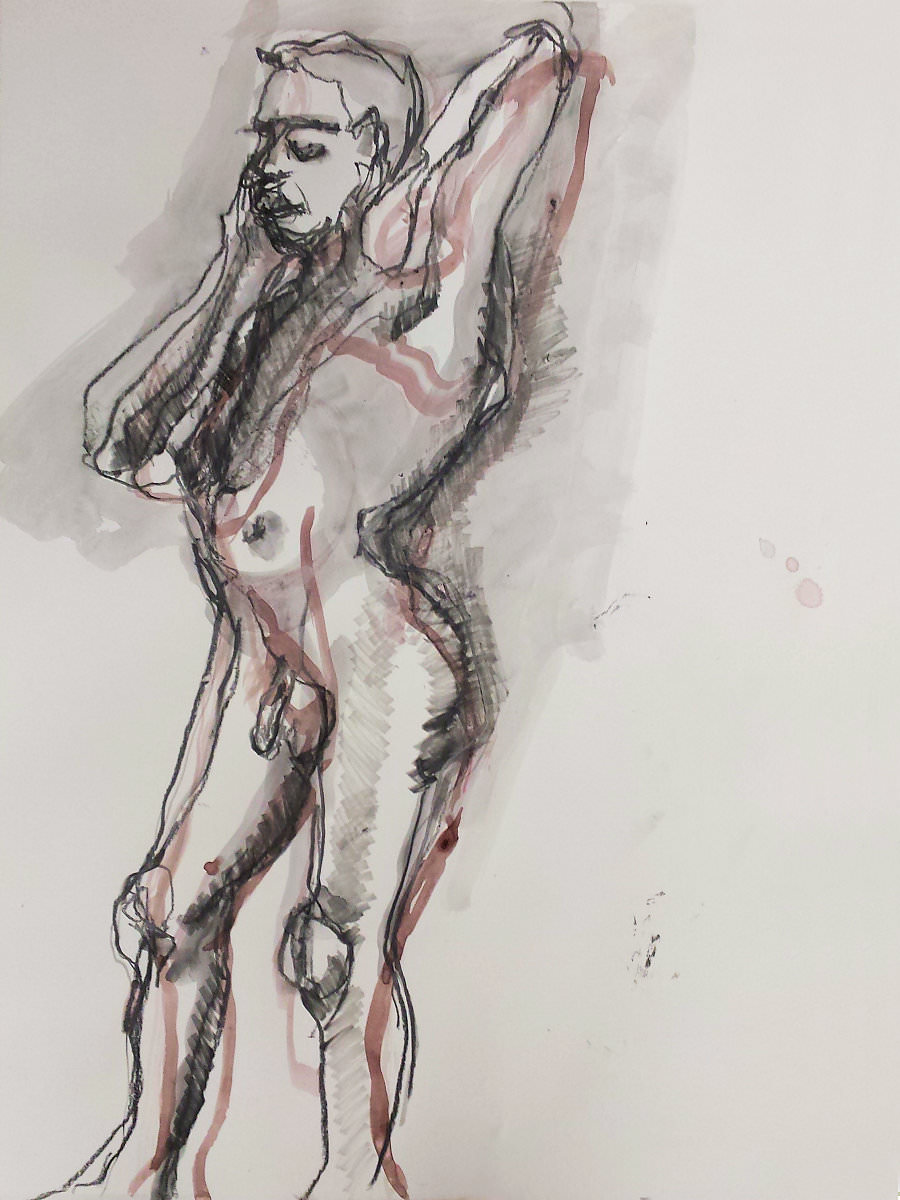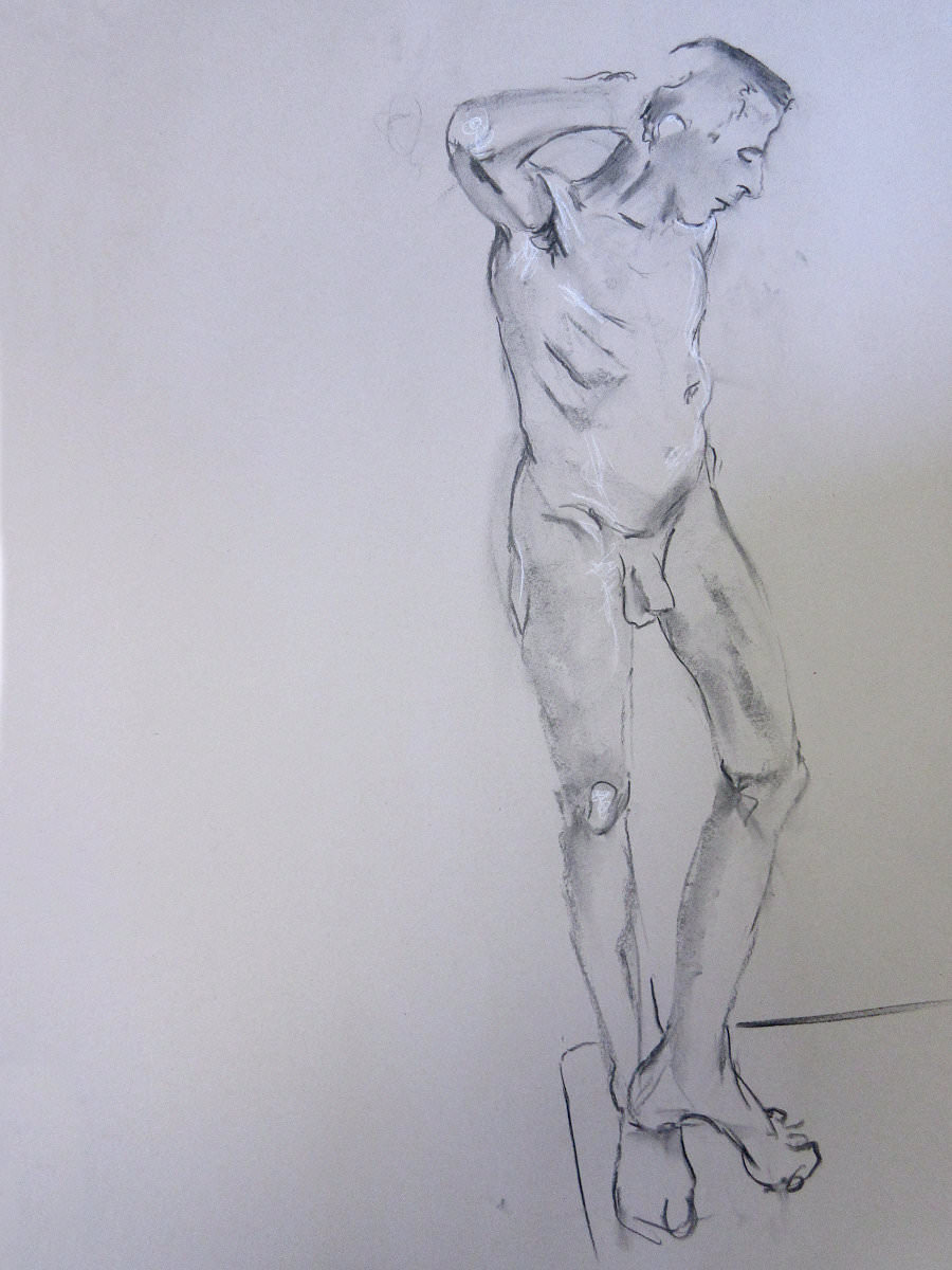 I’d been booked again for successive Wednesday sessions at Morley College, and this one was part two of two. The previous week I started off with short poses, then commenced a long pose that I would resume this evening. We changed it a little this time around, beginning with two poses of 15-minutes rather than three of 10-minutes; angles and Schiele-esque positioning were again the desired qualities.