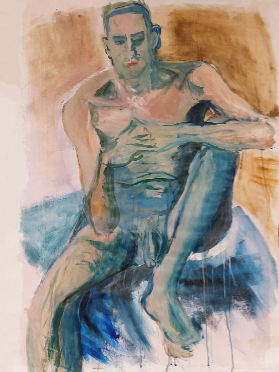 After the warm-ups, we got the furniture and me as close as we could to the positions of last week’s long pose, whilst the artists did likewise with their easels and materials. Some resumed works, others started afresh, but all were attentive to their method and composition. I sat for about 90 minutes, with a coffee break and a couple of stretches. As ever, I found the finished works diverse and strong. Hope to be back in autumn.